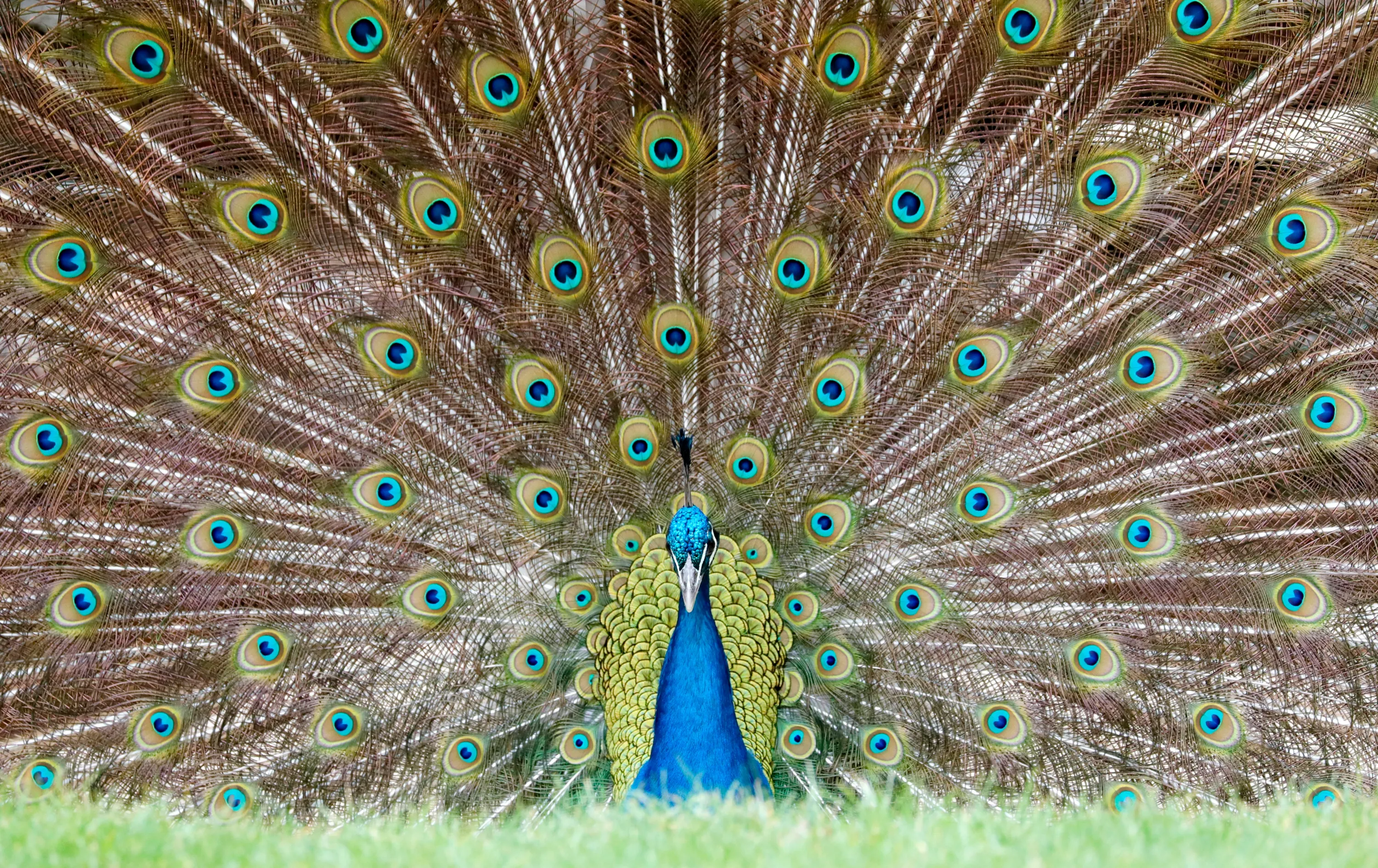 A male peacock presents his plumage at the zoo in Heidelberg, Germany, 02 May 2017. The Blue Peacock (Pavo cristatus) is a bird species from the family of pheasant-like (Phasianidae). (Photo by Ronald Wittek/EPA)