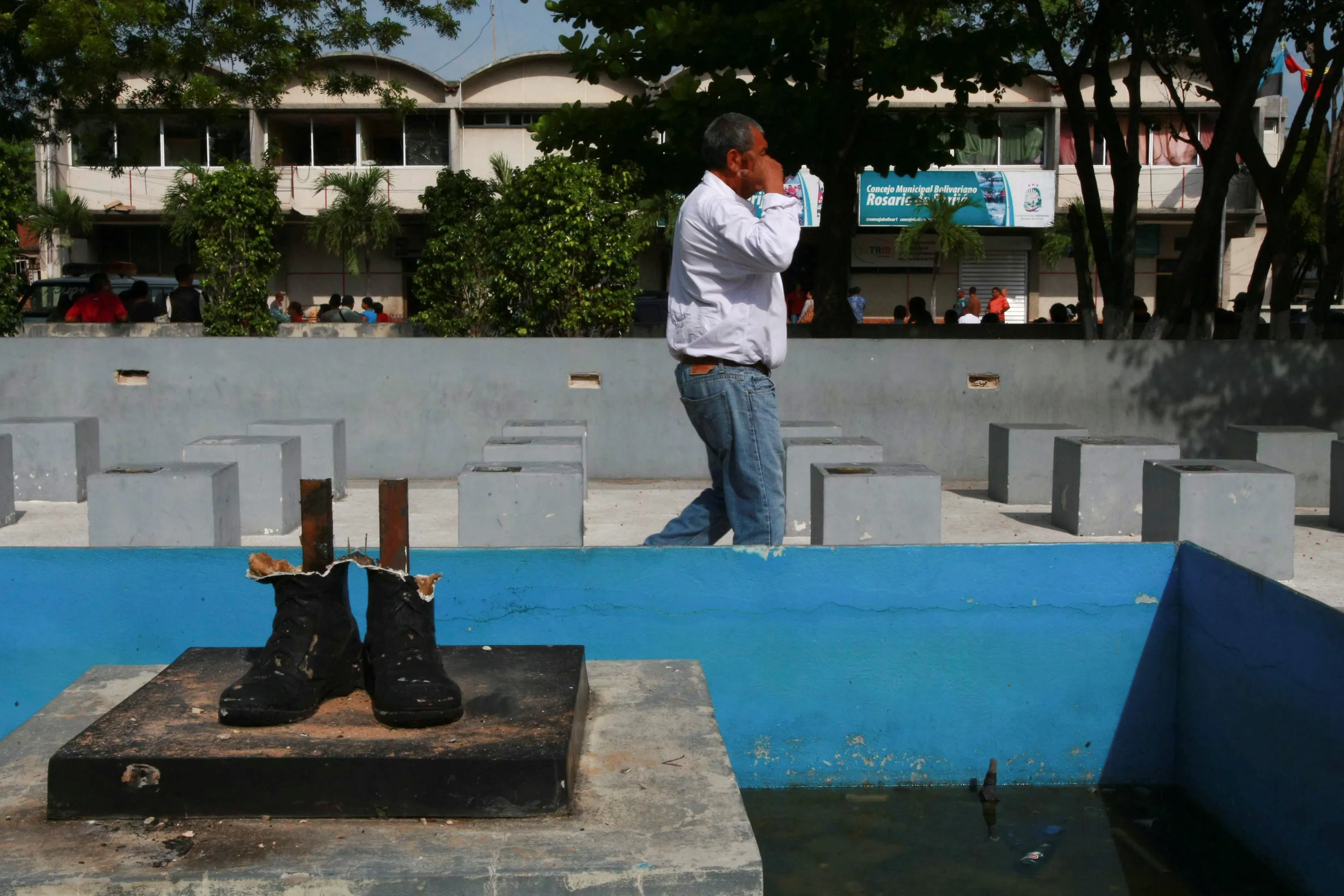 A man walks past the remains of a statue of Venezuela's late President Hugo Chavez after it was destroyed in La Villa del Rosario, Venezuela May 6, 2017. (Photo by Isaac Urrutia/Reuters)