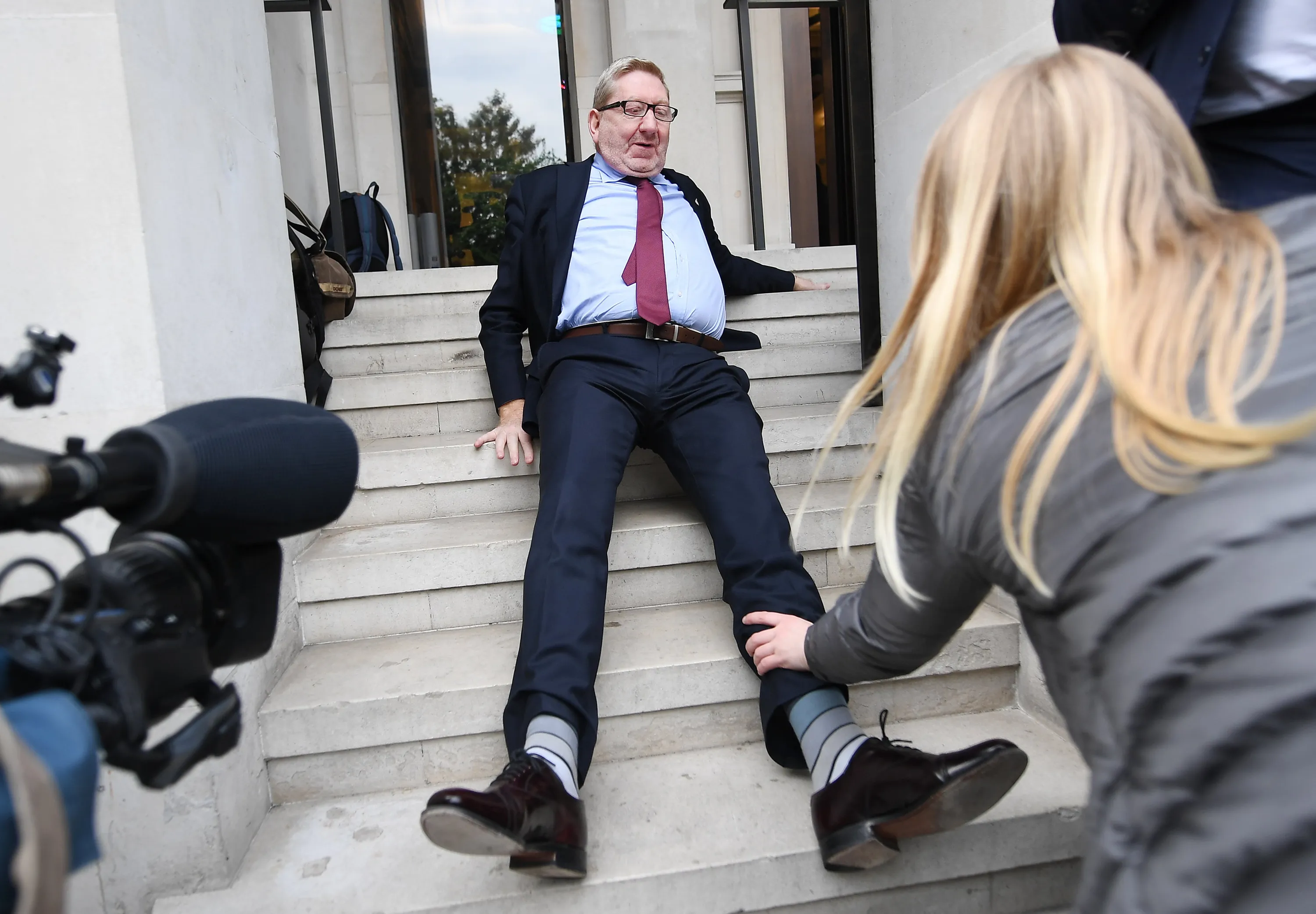 British Trade Union leader Len McCluskey falls on the steps outside the Clause 5 Labour meeting to finalise the Labour manifesto in London, Britain, 11 May 2017. The party's draft manifesto was reportedly leaked overnight in the run up to the feneral election on 08 June 2017. (Photo by Andy Rain/EPA)