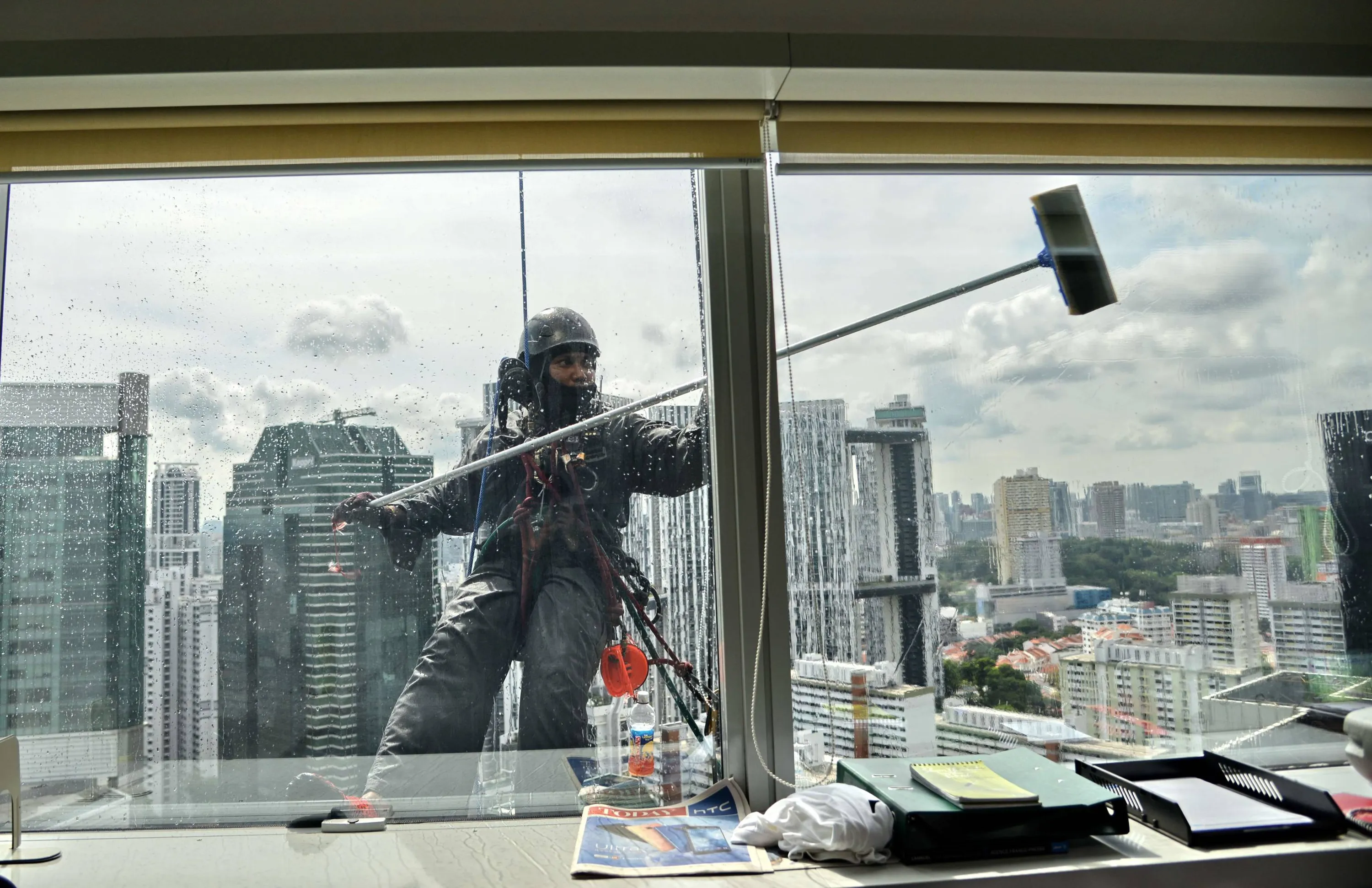A worker dangling from safety ropes, cleans windows of a high-rise office building in the business district of Singapore on May 11, 2017. (Photo by Toh Ting Wei/AFP Photo)