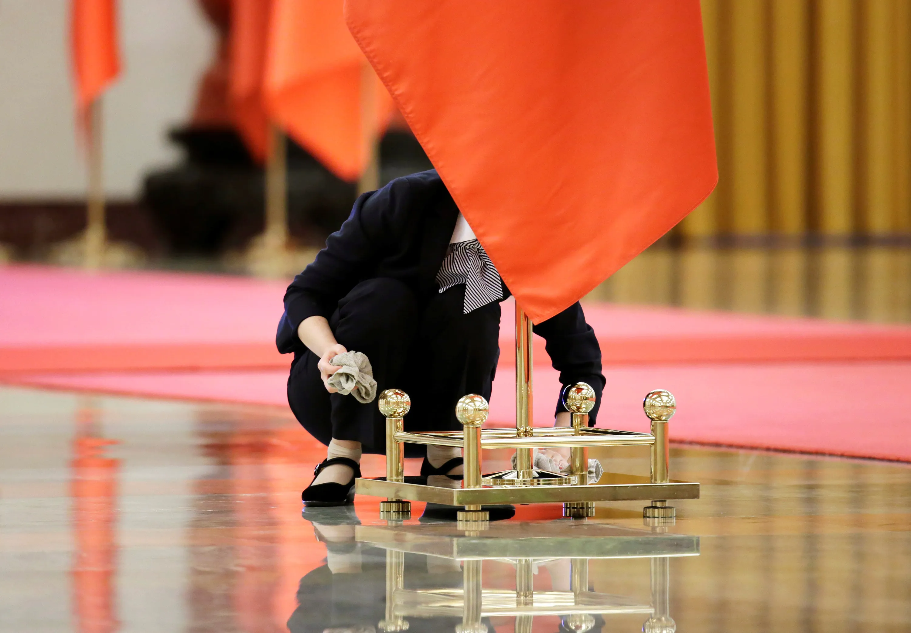 A staff member cleans a Turkish flag pole before the ceremony for Turkish President Recep Tayyip Erdogan ahead of the Belt and Road Forum in Beijing, China May 13, 2017. (Photo by Jason Lee/Reuters)