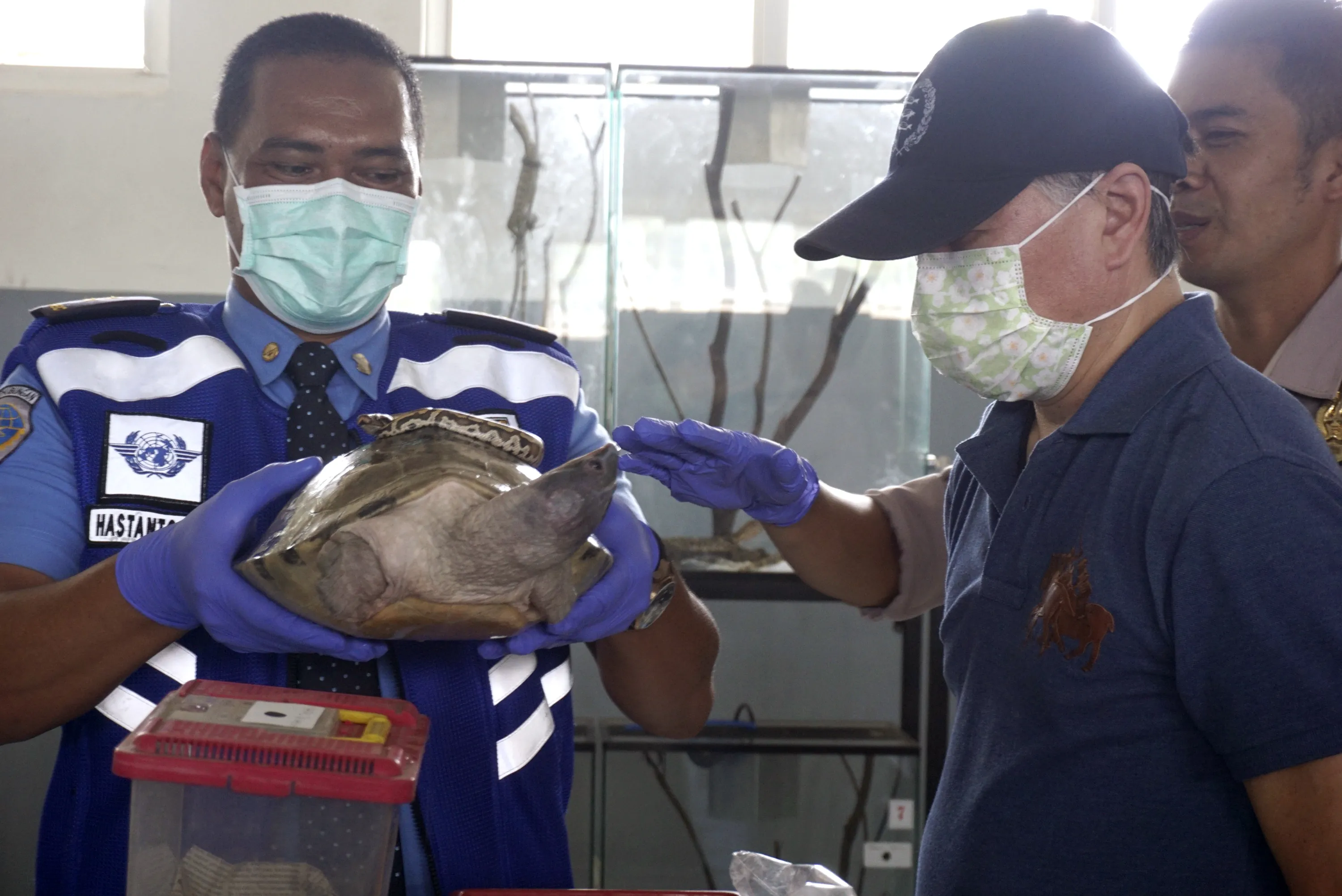 In this May 16, 2017 photo, custom officers show a pig-nosed turtle and a Japanese suspect, Naito Katsuhide, front right, during a press conference at the quarantine facility of Soekarno-Hatta International Airport on the outskirts of Jakarta, Indonesian authorities have arrested a Japanese man who conservationists says is a major player in the illegal wildlife trade for attempting to smuggle more than 250 reptiles out of the country. (Photo by AP Photo/Stringer)