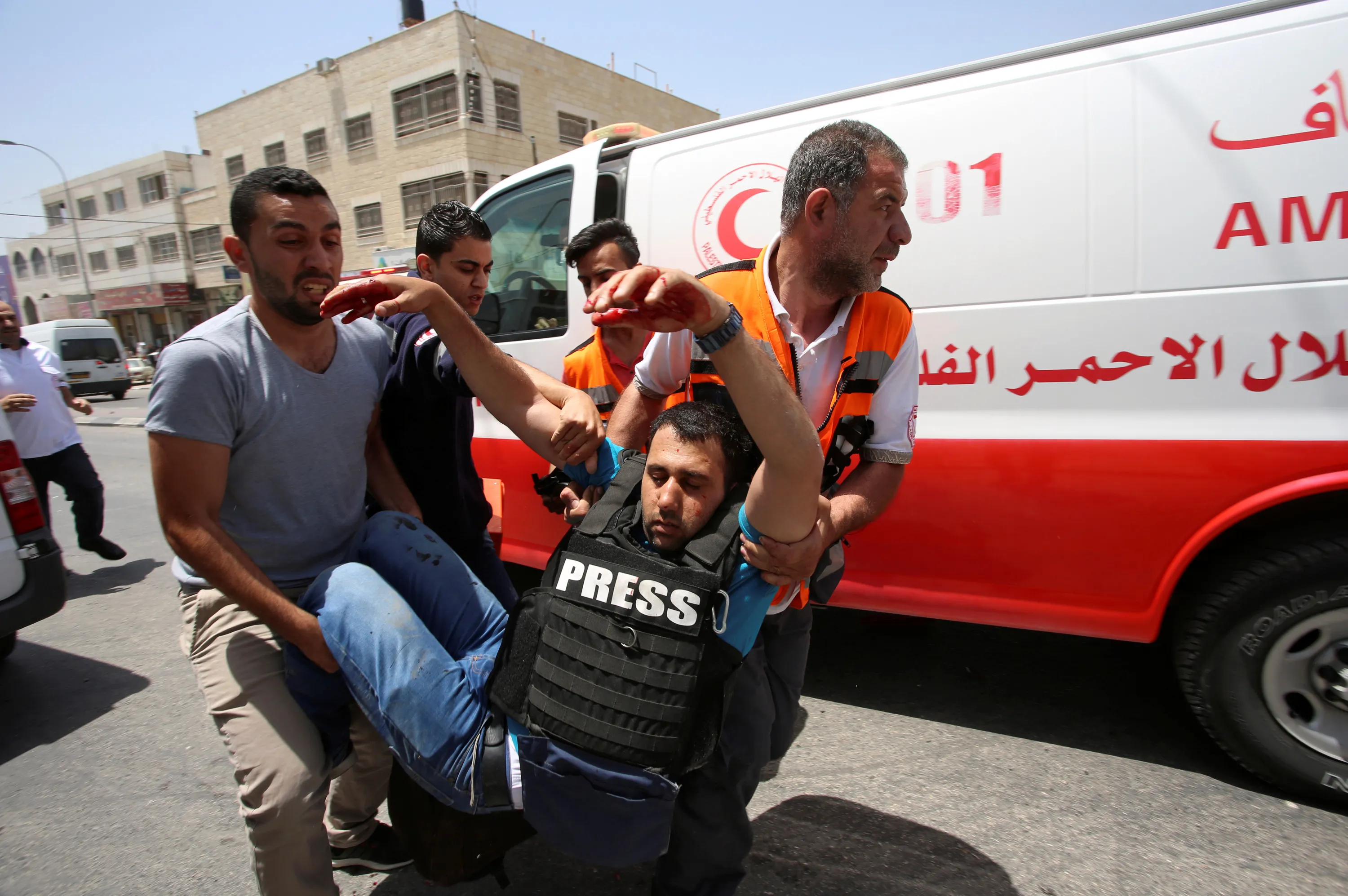A wounded photographer is evacuated during clashes between Palestinians and Israelis near the Hawara checkpoint near the West Bank city of Nablus on May 18, 2017. (Photo by Reuters/Stringer)