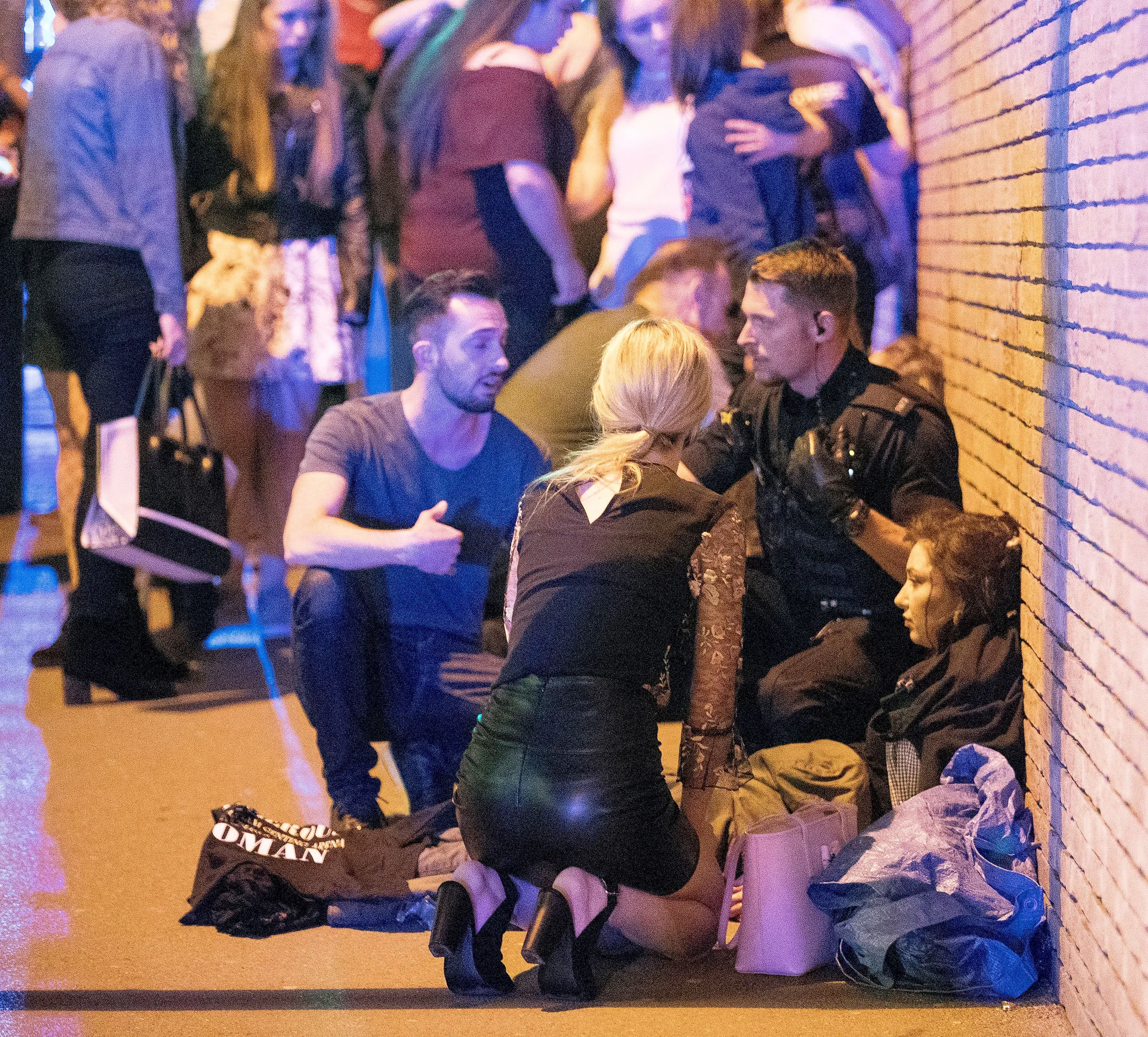Police and other emergency services are seen near the Manchester Arena after reports of an explosion. Police have confirmed they are responding to an incident during an Ariana Grande concert at the venue. Reported Explosion at Manchester Arena, UK on May 22, 2017. (Photo by Rex Features via AP Images)