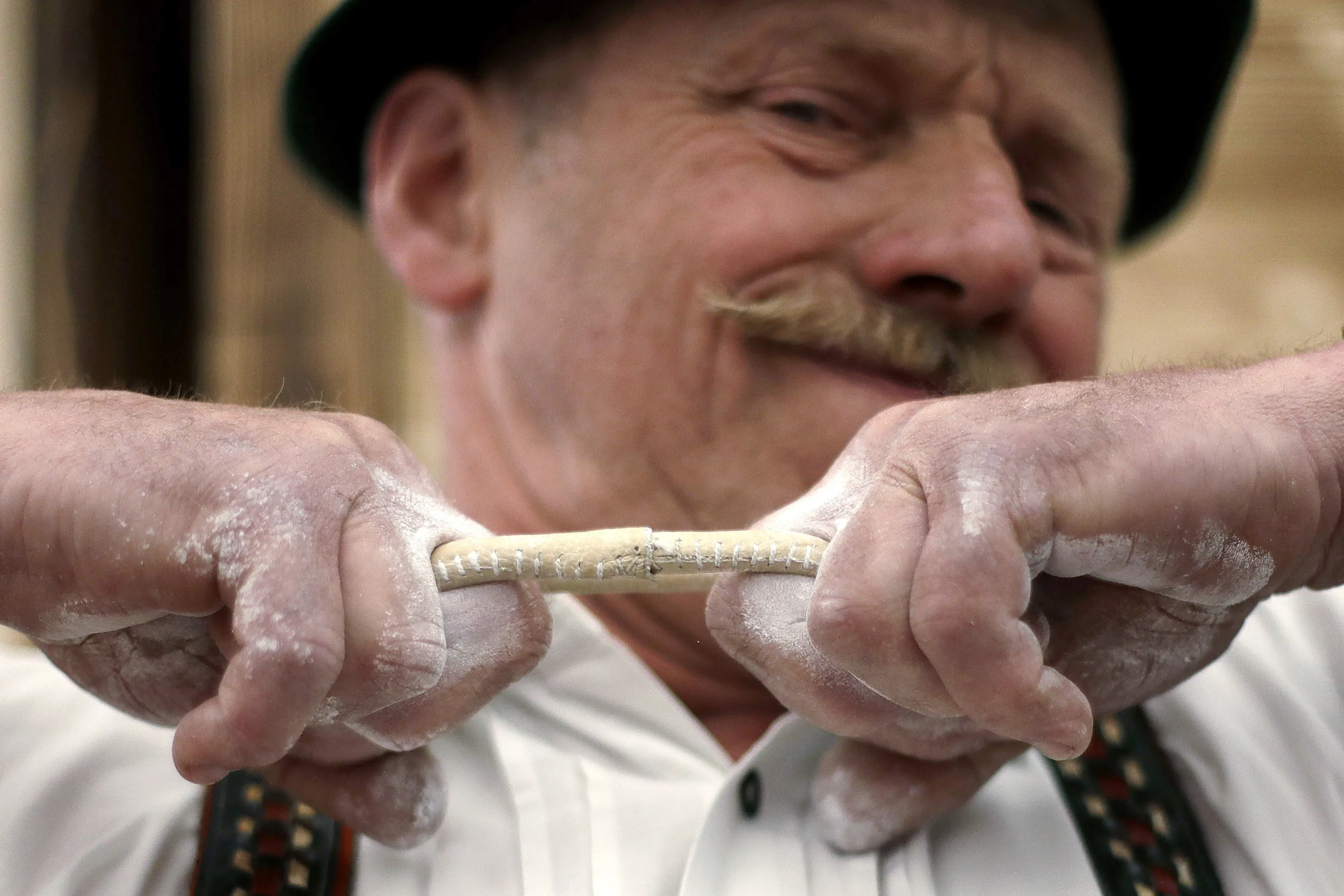 Georg Schoettl from Ohlstadt near Murnau warms up with a leather strap prior to his fight at the 40th Alpine Country Championships in Fingerhakeln_finger wrestling_ in Woernsmuehl, Germany, Thursday, May 25, 2017. (Photo by Matthias Schrader/AP Photo)