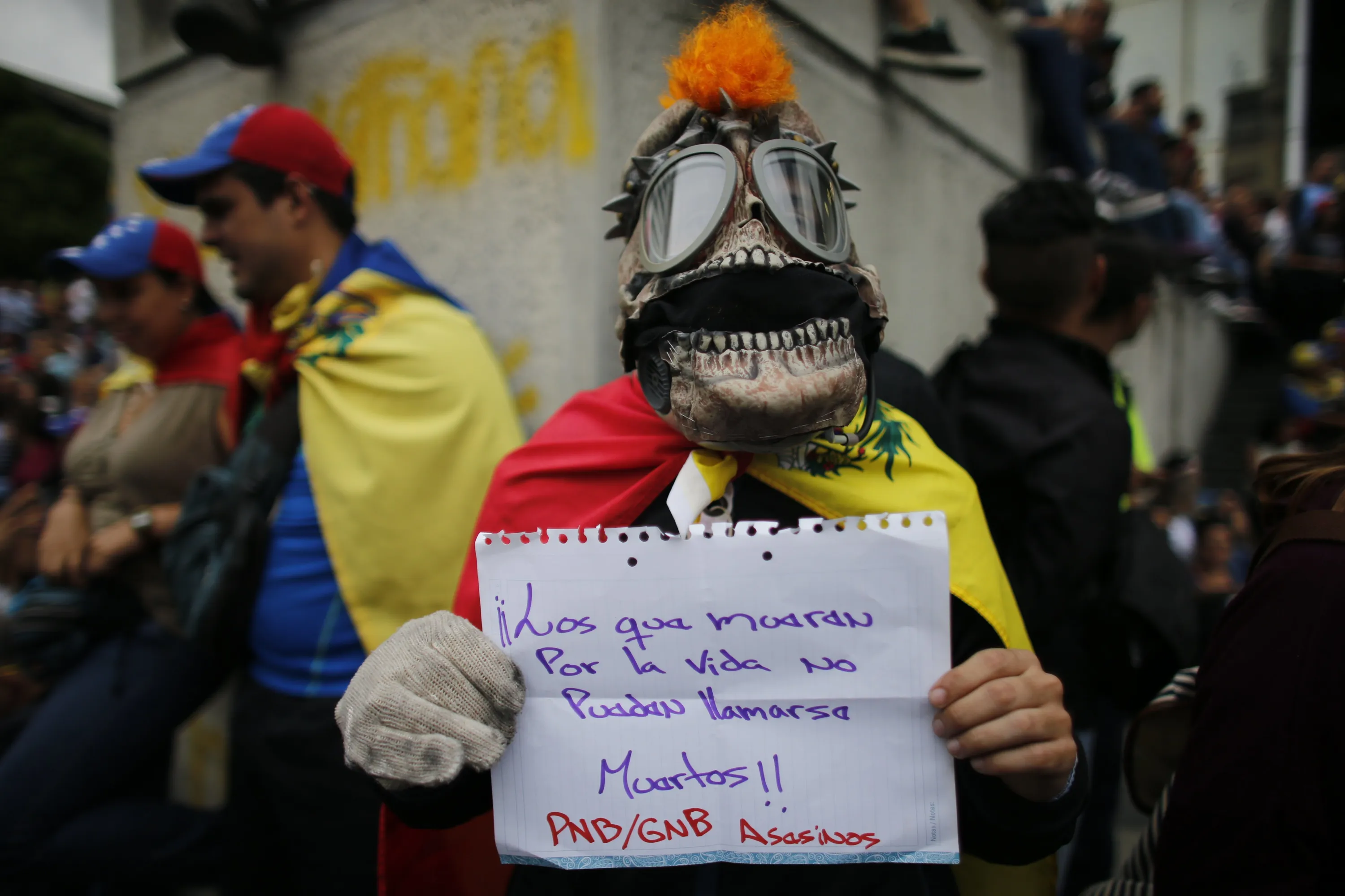 A masked man holds a sign that reads in Spanish “Those who die for life cannot be called dead!” and “Bolivarian National Guard (GNB), Bolivarian National Police (PNB) killers” marches with others to the site where protester Neomar Lander died in Caracas, Venezuela, Thursday, June 8, 2017. Lander, 17, is one of the latest victims of Venezuela's unrest. He died during anti-government protests on Wednesday. (Photo by Ariana Cubillos/AP Photo)