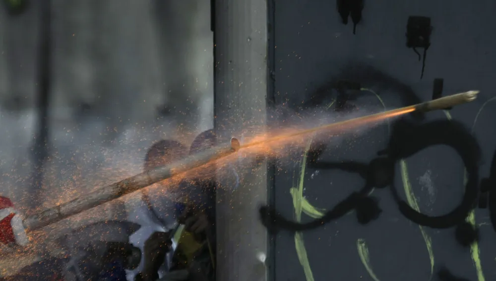 In this June 7, 2017 photo, demonstrators launch fireworks at police during clashes between authorities and anti-government demonstrators in Caracas, Venezuela. Nearly 70 people have died in two months of political unrest fed by Venezuela's triple-digit inflation, widespread food shortages and high crime. Demonstrators are demanding a new presidential election. (Photo by Fernando Llano/AP Photo)