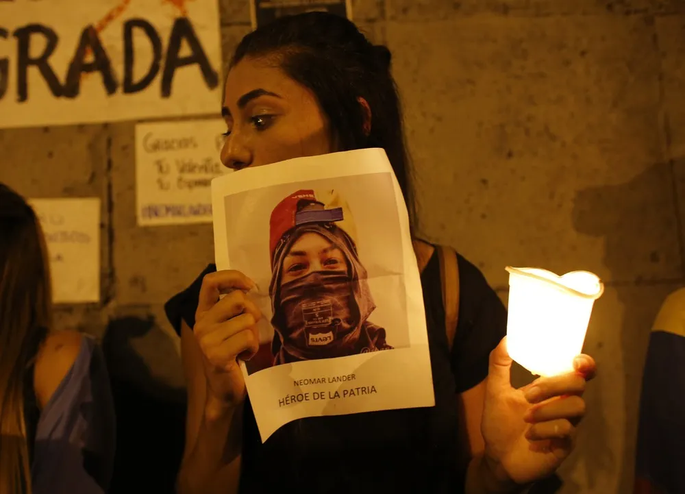A woman holds a picture of Neomar Lander that reads in Spanish “Hero of the homeland” during a candlelight vigil at the site where he died in Caracas, Venezuela, Thursday, June 8, 2017. (Photo by Ariana Cubillos/AP Photo)