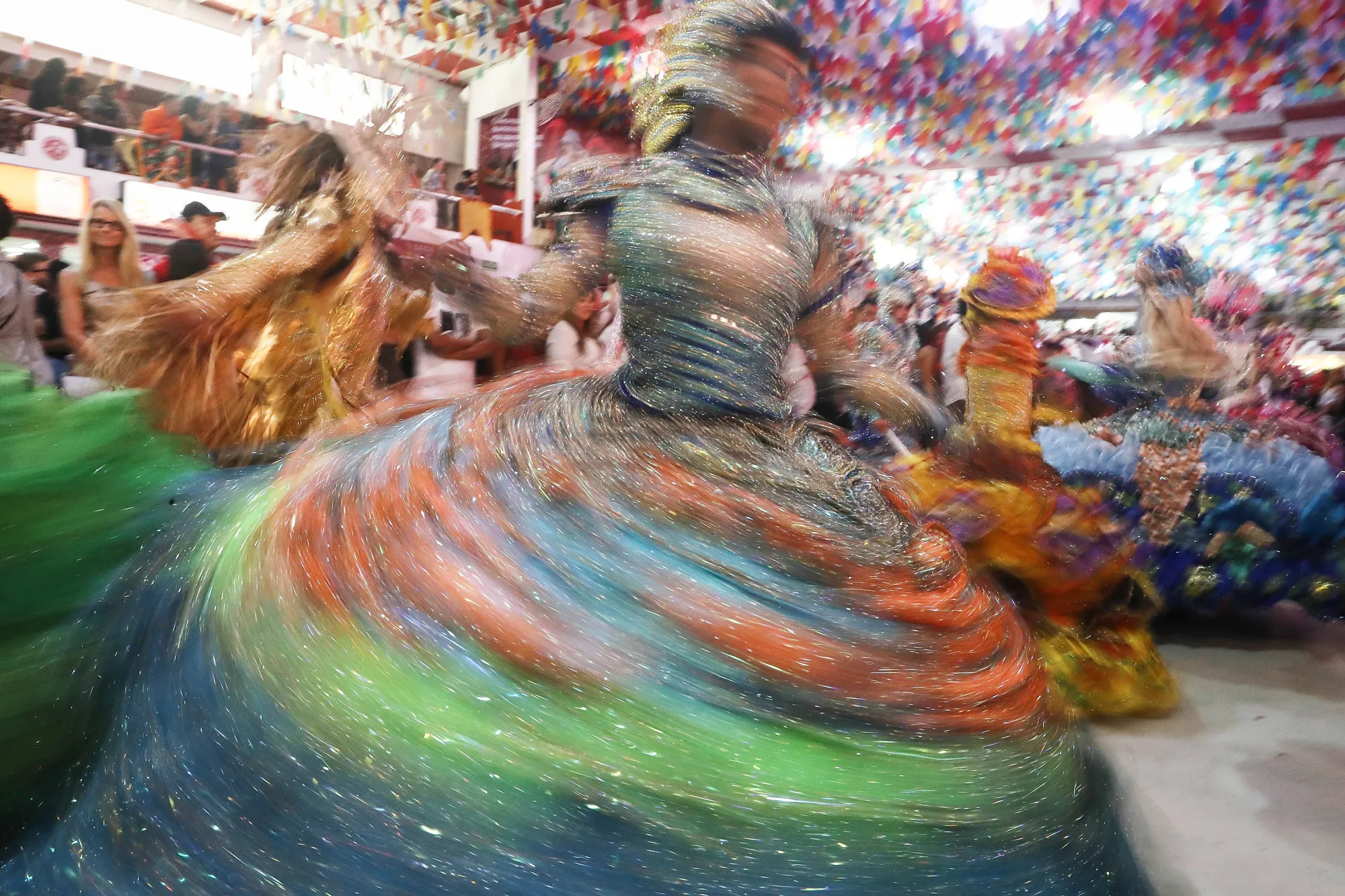 Dancers are blurred performing during a traditional Festas Juninas (June Festivals) party at the Salgueiro samba school on June 18, 2017 in Rio de Janeiro, Brazil. Rio Mayor Marcelo Crivella, a religious conservative, has announced plans to cut funding for the famed samba school Carnival parades by fifty percent for the 2018 Carnival amidst an economic crisis in the city. Organizers from the samba schools announced if they don't receive proper funding they will have to cancel the parades for 2018. Carnival annually draws around 1 million tourists to Rio. (Photo by Mario Tama/Getty Images)