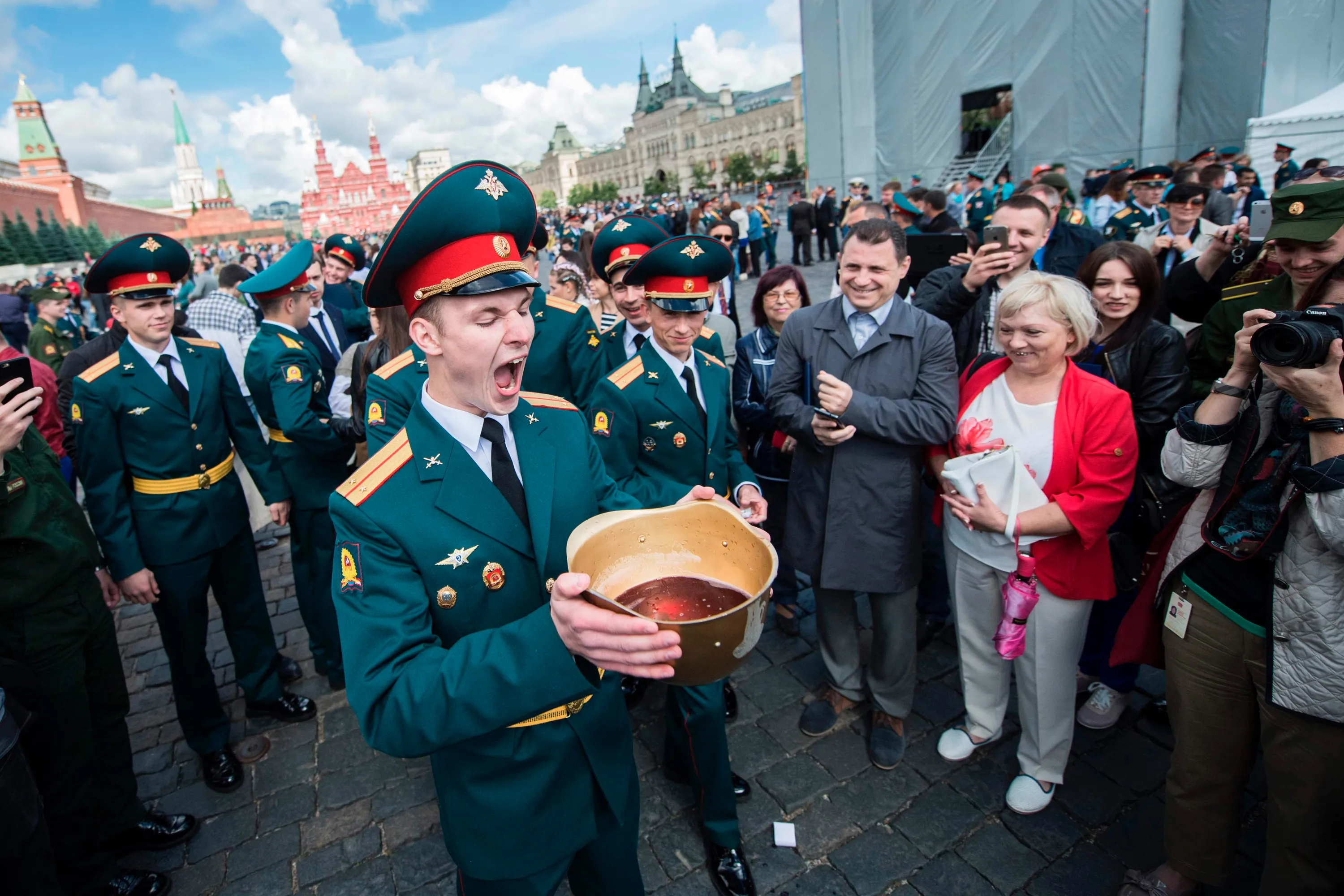 Graduates of the Moscow Military Commanders Training School drink sparkling wine from a helmet during their graduation ceremony at Red Square in Moscow on June 23, 2017. (Photo by Natalia Kolesnikova/AFP Photo)