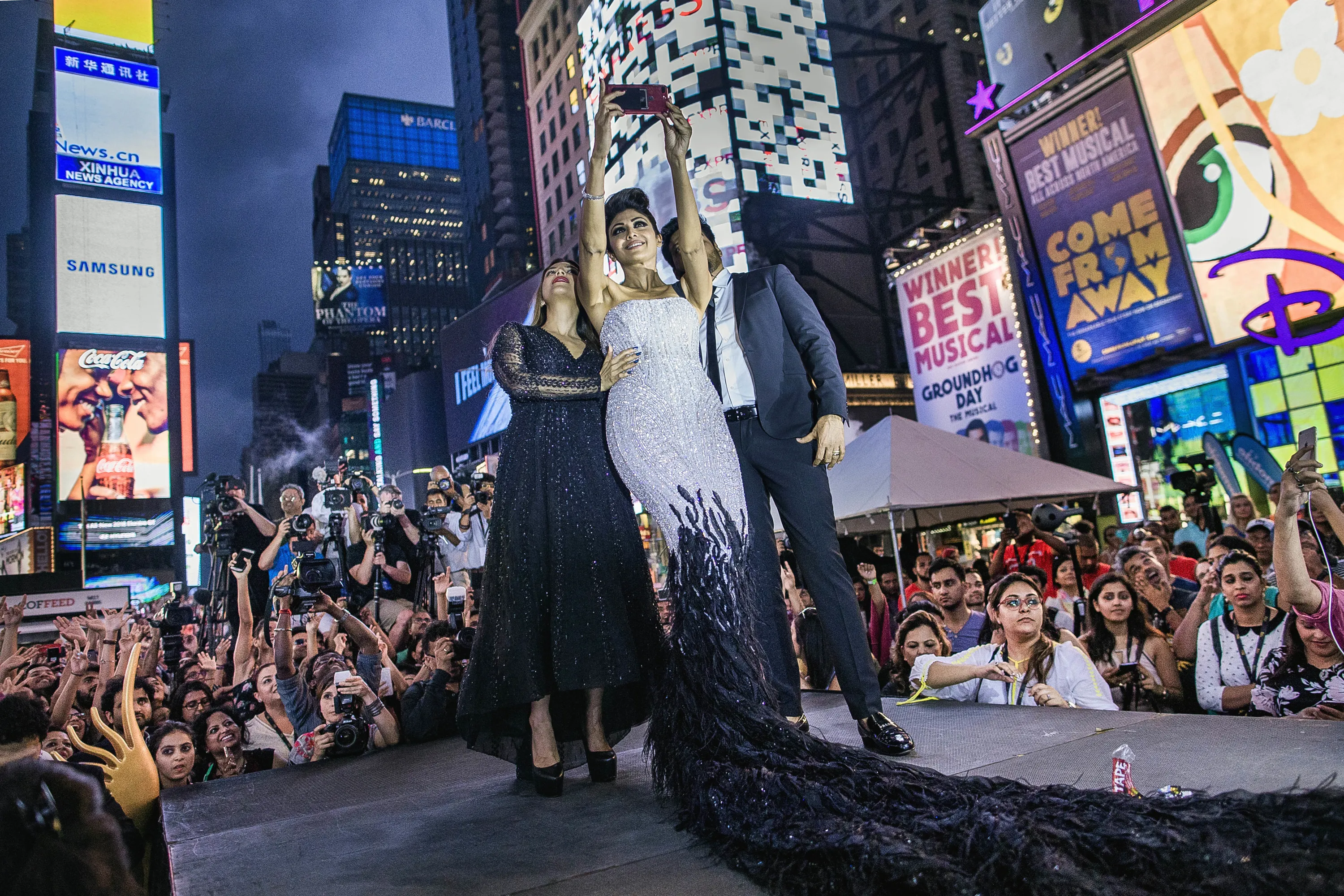 Shilpa Shetty, center, takes a selfie as she participates of a fashion show during The 18th edition of the International Indian Film Academy (IIFA) awards weekend event at Times Square on Thursday, July 13, 2017, in New York. (Photo by Andres Kudacki/AP Photo)
