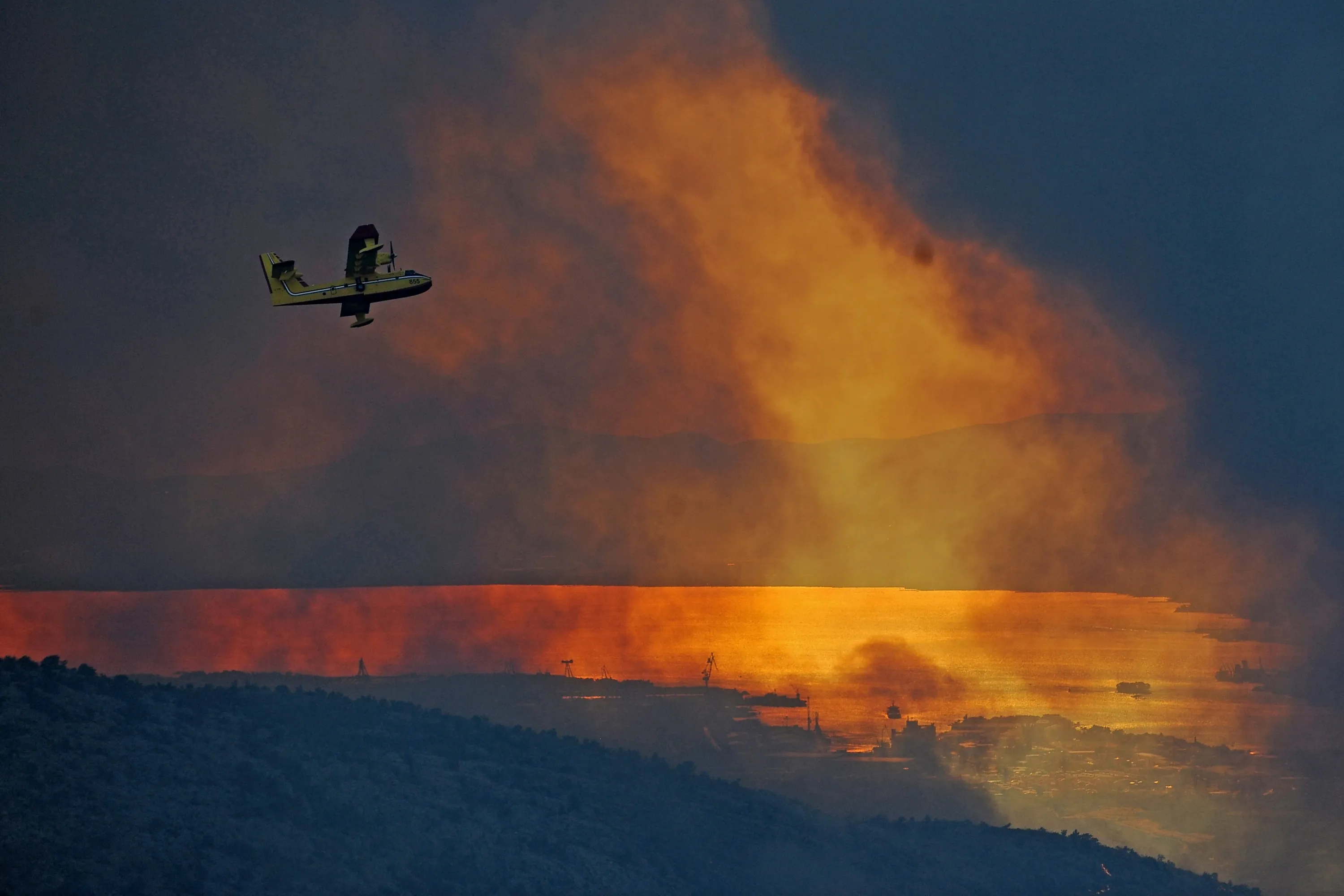 A firefighting aircraft flies over areas burnt by wildfires around Split, Croatia, 18 July 2017. Croatian firemen try put the wildfires under control along the Adriatic coast that has damaged and destroyed some houses in villages around the city of Split. (Photo by EPA/Stringer)