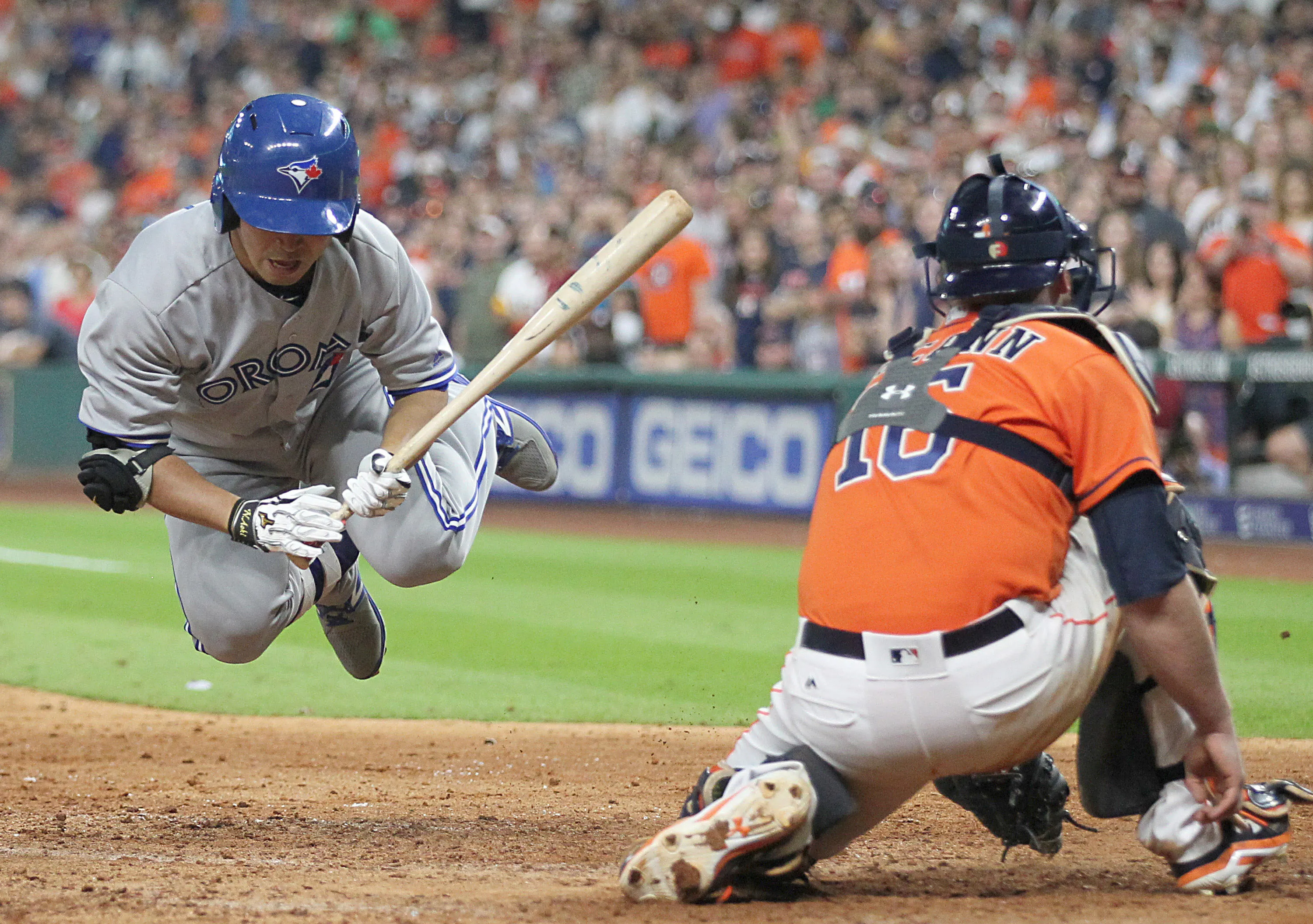 Toronto Blue Jays left fielder Norichika Aoki (23) avoids being hit by a pitch against the Houston Astros in the ninth inning at Minute Maid Park on August 4, 2017 in Houston, TX, USA. (Photo by Thomas B. Shea/USA TODAY Sports)