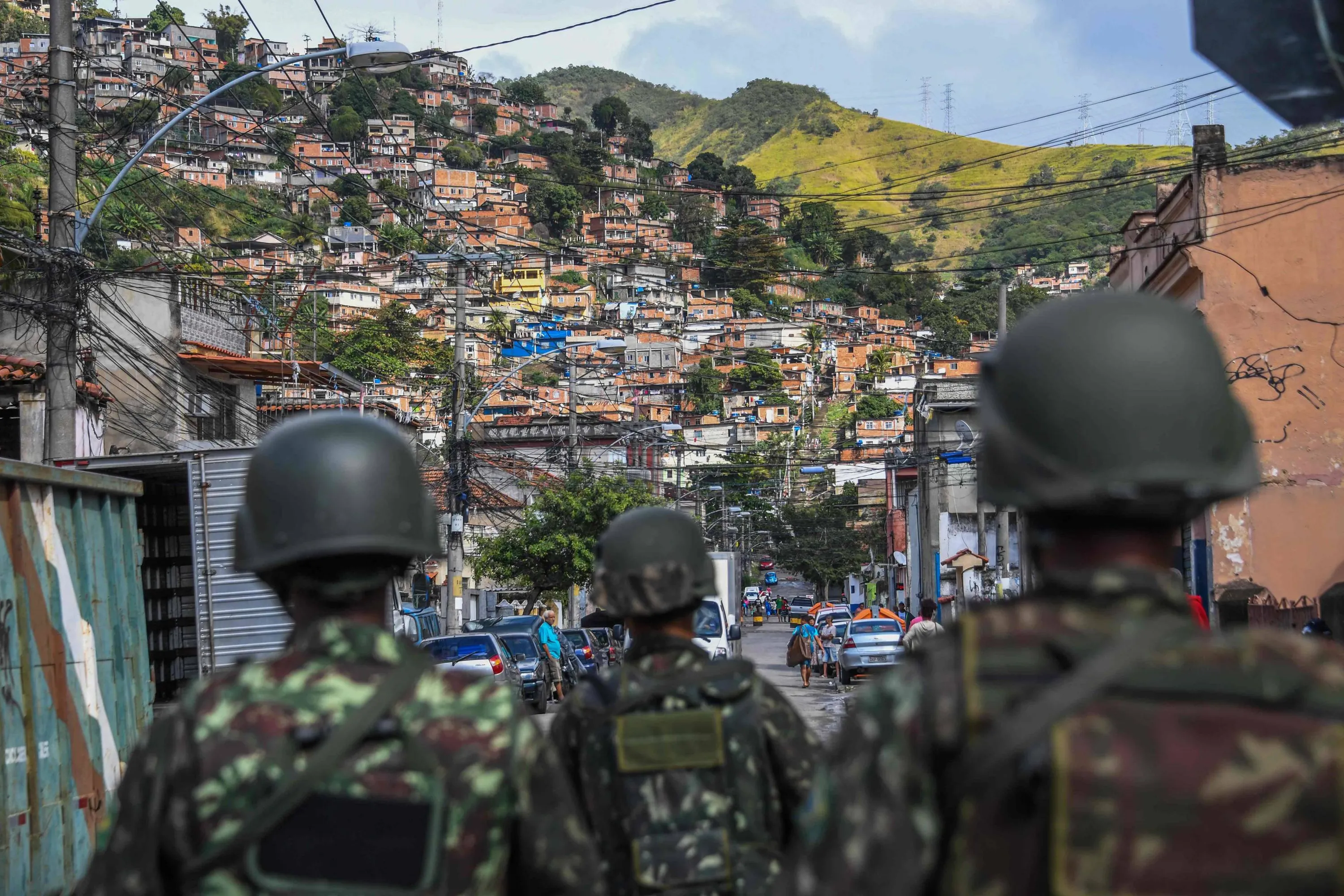 Soldiers take part in a crackdown on crime gangs, at the Lins de Vasconcelos slum complex in Rio de Janeiro, Brazil, on August 5, 2017. Thousands of Brazilian army troops raided Rio de Janeiro slums leaving parts of the city looking like a war zone. Their main goal was to stop gangs behind a surge in brazen robberies of commercial trucks, with arrest warrants issued for 40 people. However, the unusually aggressive pre-dawn operation also follows wider concerns that nearly bankrupt post-Olympic Rio is spinning out of control. (Photo by Apu Gomes/AFP Photo)