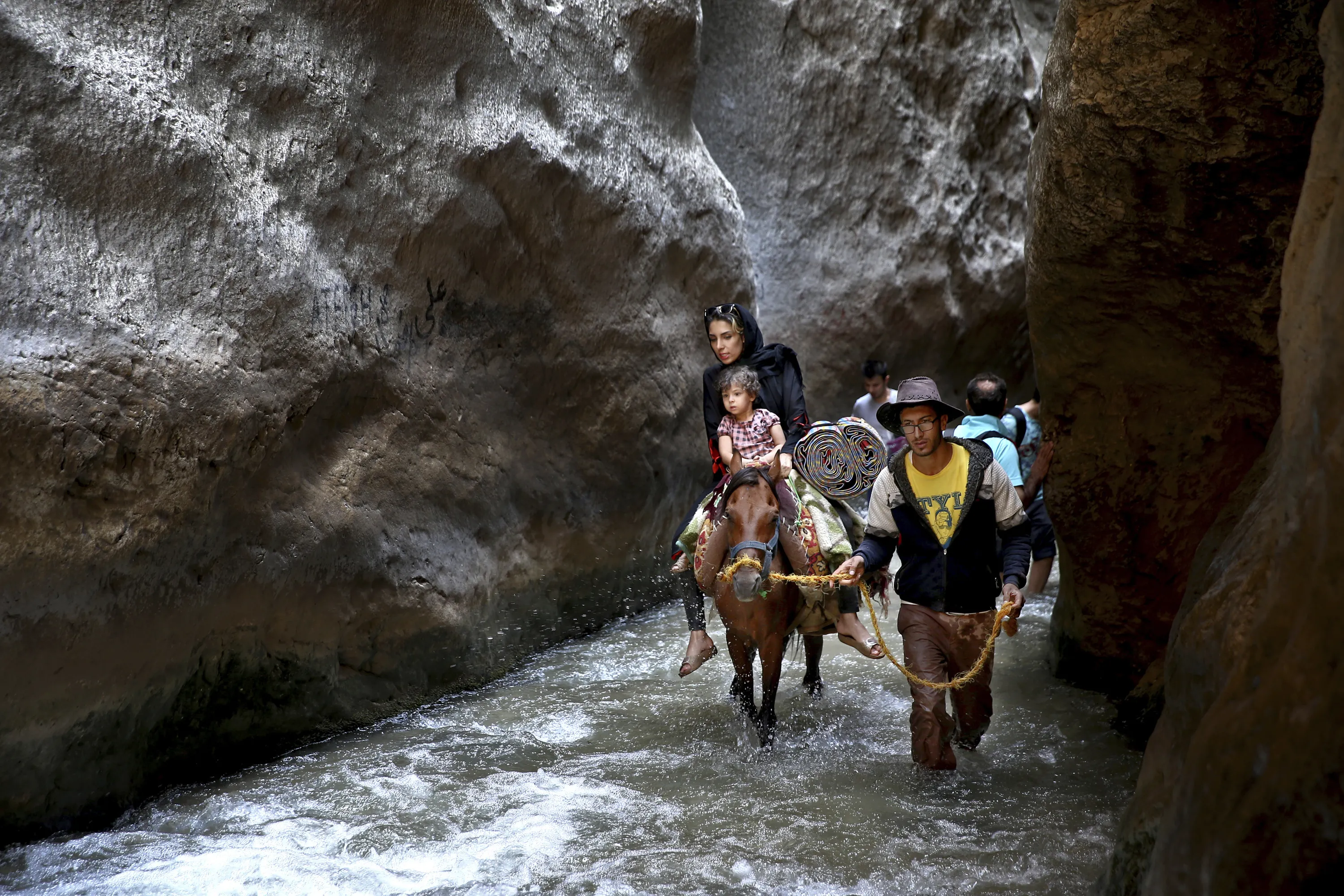 In this Monday, August 7, 2017, photo, a man leads his horse as two tourists ride in the river streaming between two cliffs at Tangeh Vashi canyon, just 99 miles (160 kilometers) north of Tehran, Iran. In a one-day excursion near the Iranian capital to escape the August heat in Tangeh Vashi, a canyon with an ice-cold mountain river streaming through, and a summer destination for many residents of the capital as well as neighboring provinces of Tehran. (Photo by Ebrahim Noroozi/AP Photo)