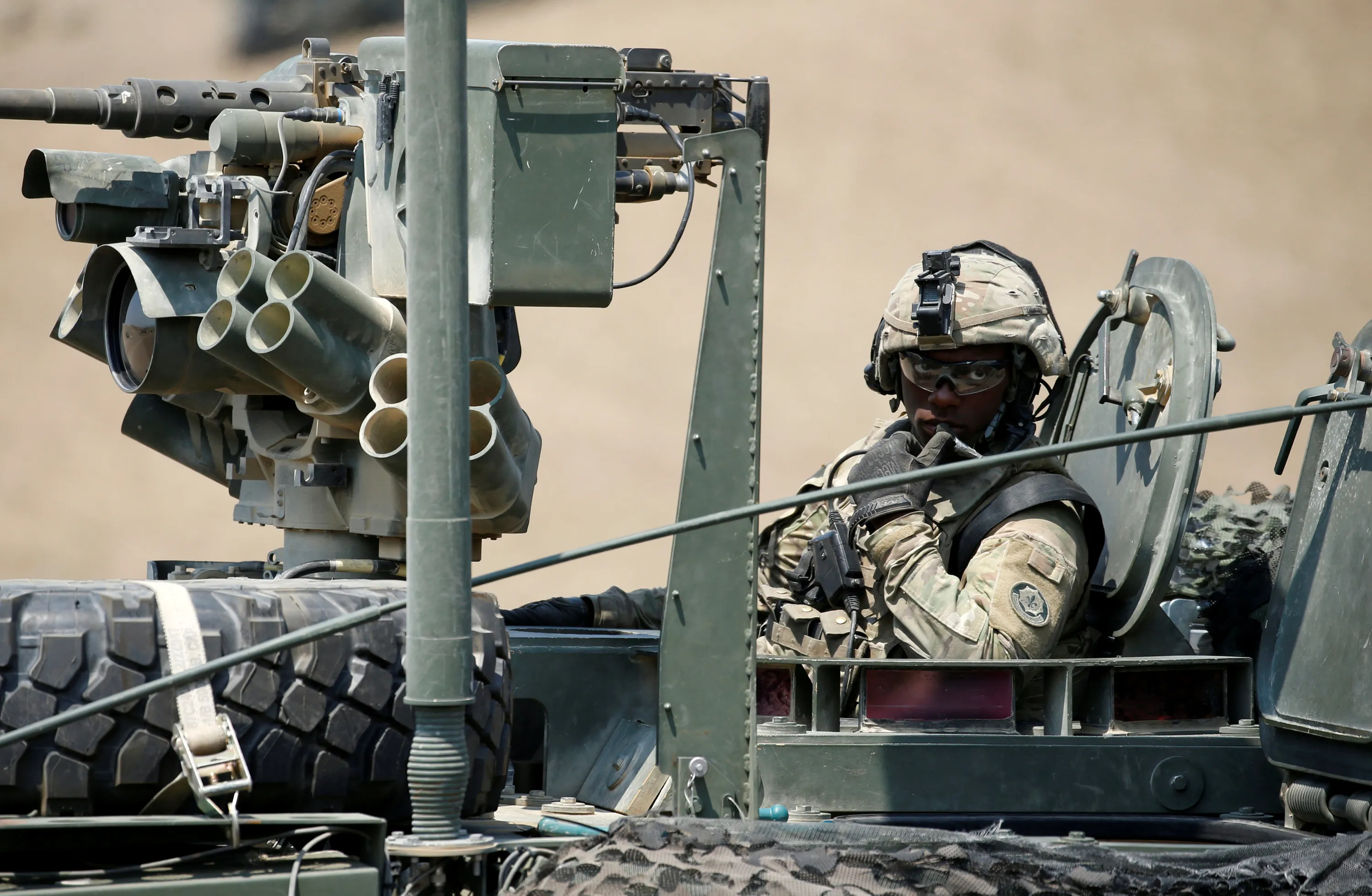 A US serviceman sits on M1126 Stryker Infantry Carrier Vehicle (ICV) during a closing ceremony of NATO-led joint military exercises Noble Partner 2017 at Vaziani Training Area outside Tbilisi, Georgia, August 12, 2017. (Photo by David Mdzinarishvili/Reuters)