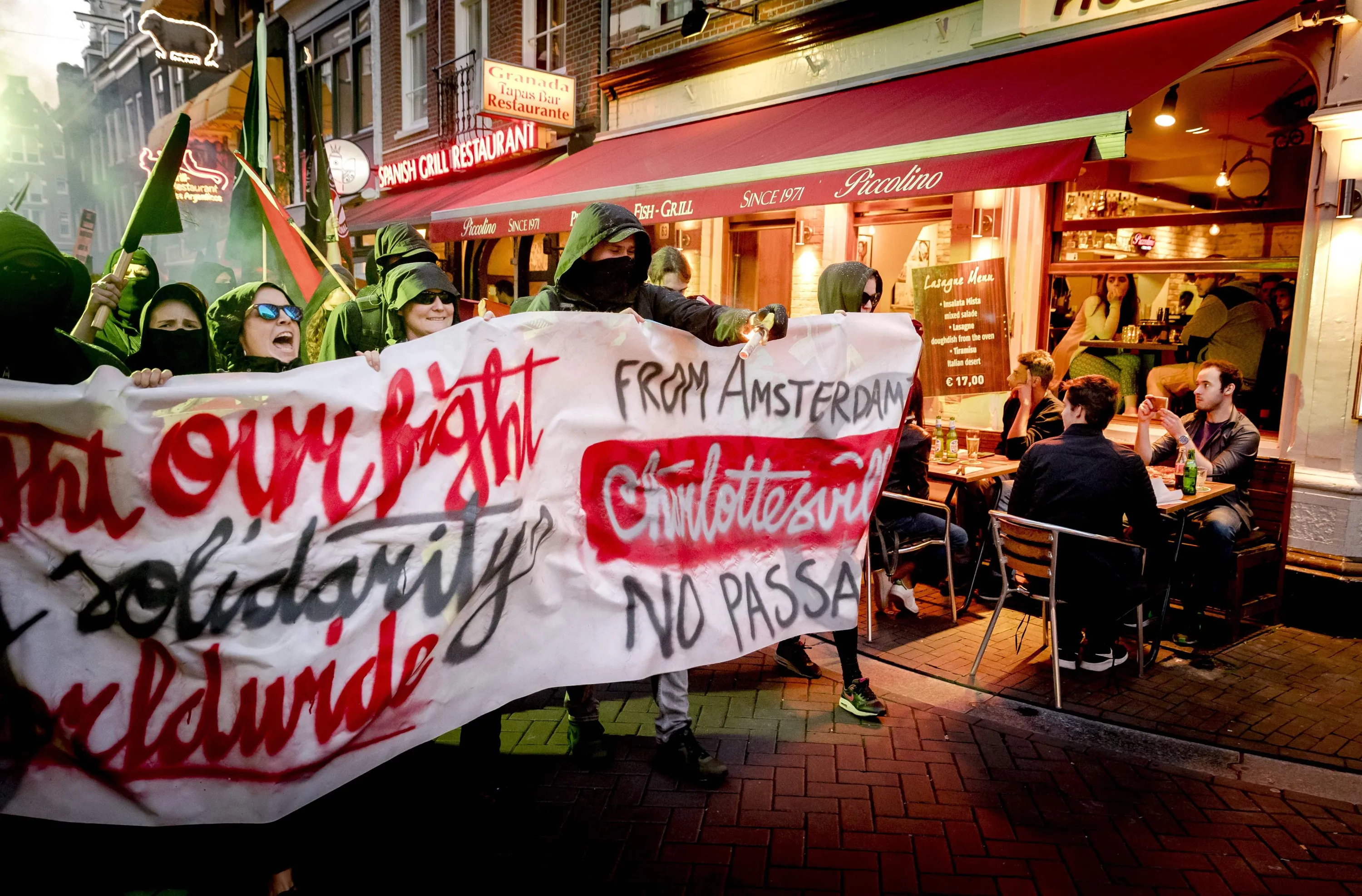 People take part in a protest called by the Dutch Antifascist Action AFA (Anti Fascistische Actie) in Amsterdam against the violence that took place at the August 12 th “Unite the Right” rally in Charlottesville, Virginia on August 17, 2017. A woman died and 19 injured in the city of Charlottesville when a car plowed into a crowd of people after a rally by Ku Klux Klan members and other white nationalists turned violent. Two state police officers died in a helicopter crash near the area. (Photo by Remko de Waal/AFP Photo/ANP)