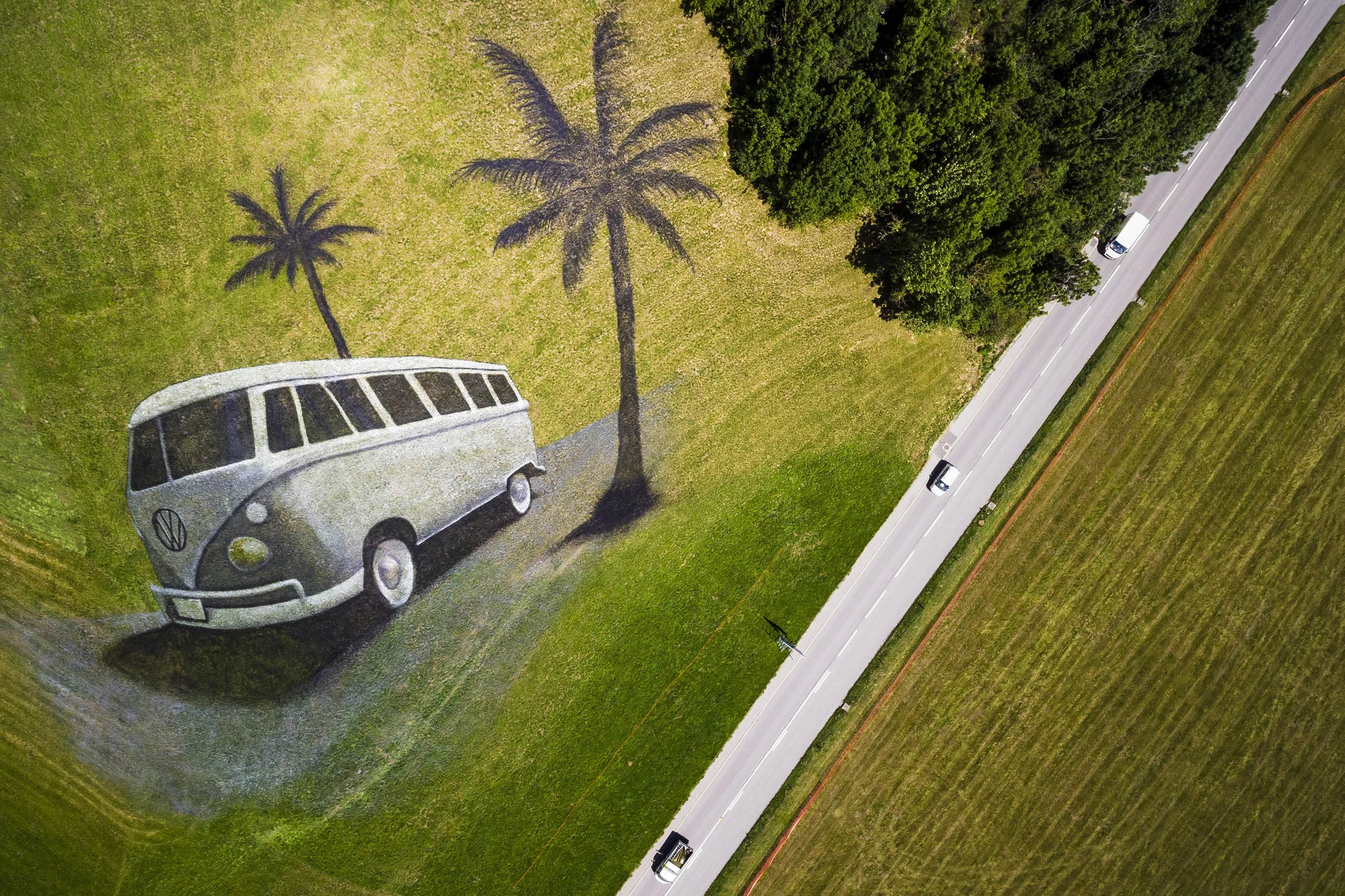 A land art painting by French artist Saype, depicting a Volkswagen (VW) bus, is pictured on a hill in Chateau d'Oex, Switzerland, Wednesday, August 23, 2017. The artwork covering approximately 4200 square meters was produced with over 400 liters of biodegradable paint made from natural pigments, water and a milk protein and is part of the upcoming 20th international VW festival. (Photo by Valentin Flauraud/Keystone via AP Photo)