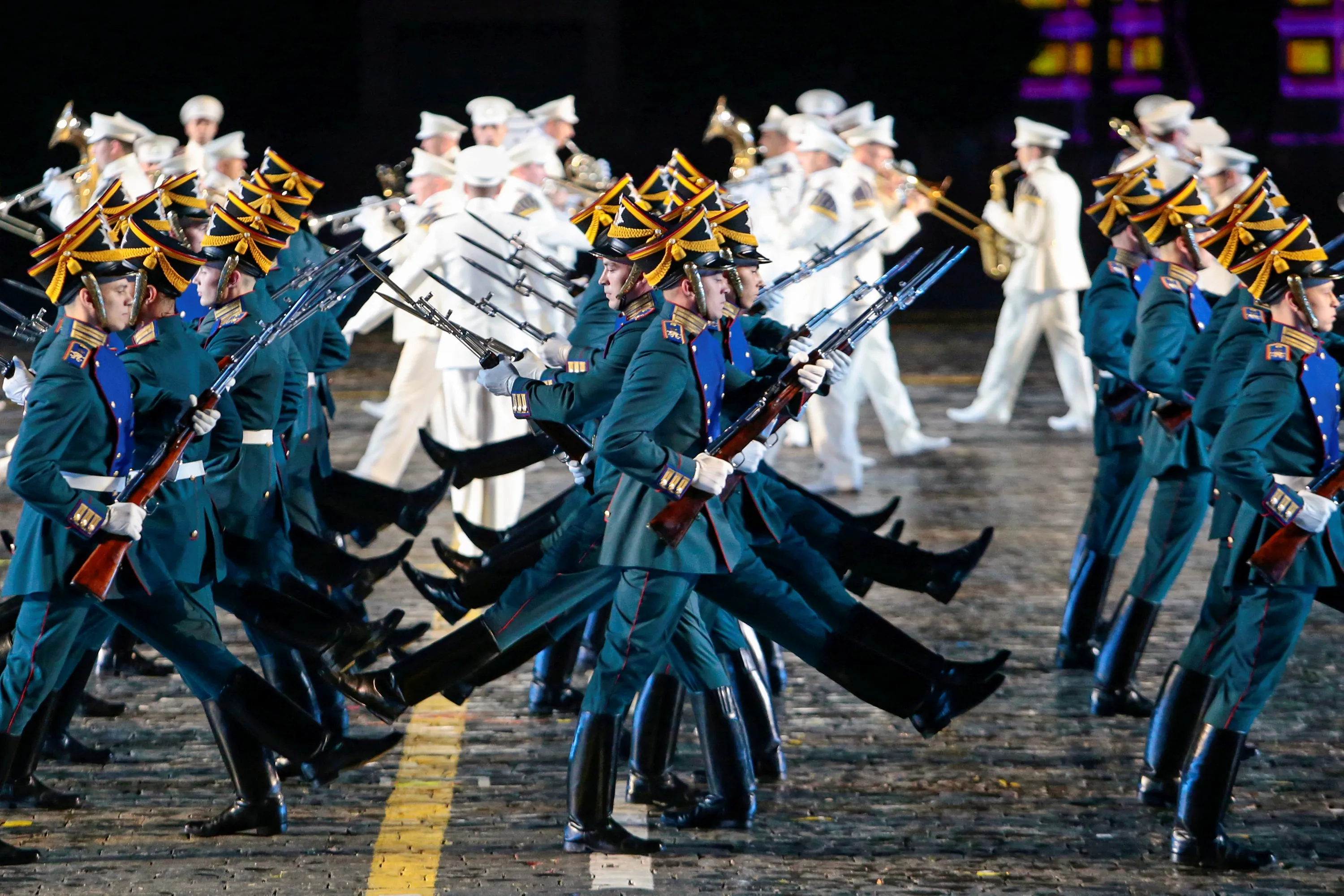 Members of the Guard of Honour of the Presidential regiment perform during the International Military Orchestra Music Festival “Spasskaya Tower” in Red Square in Moscow, Russia, August 26, 2017. (Photo by Andrey Volkov/Reuters)