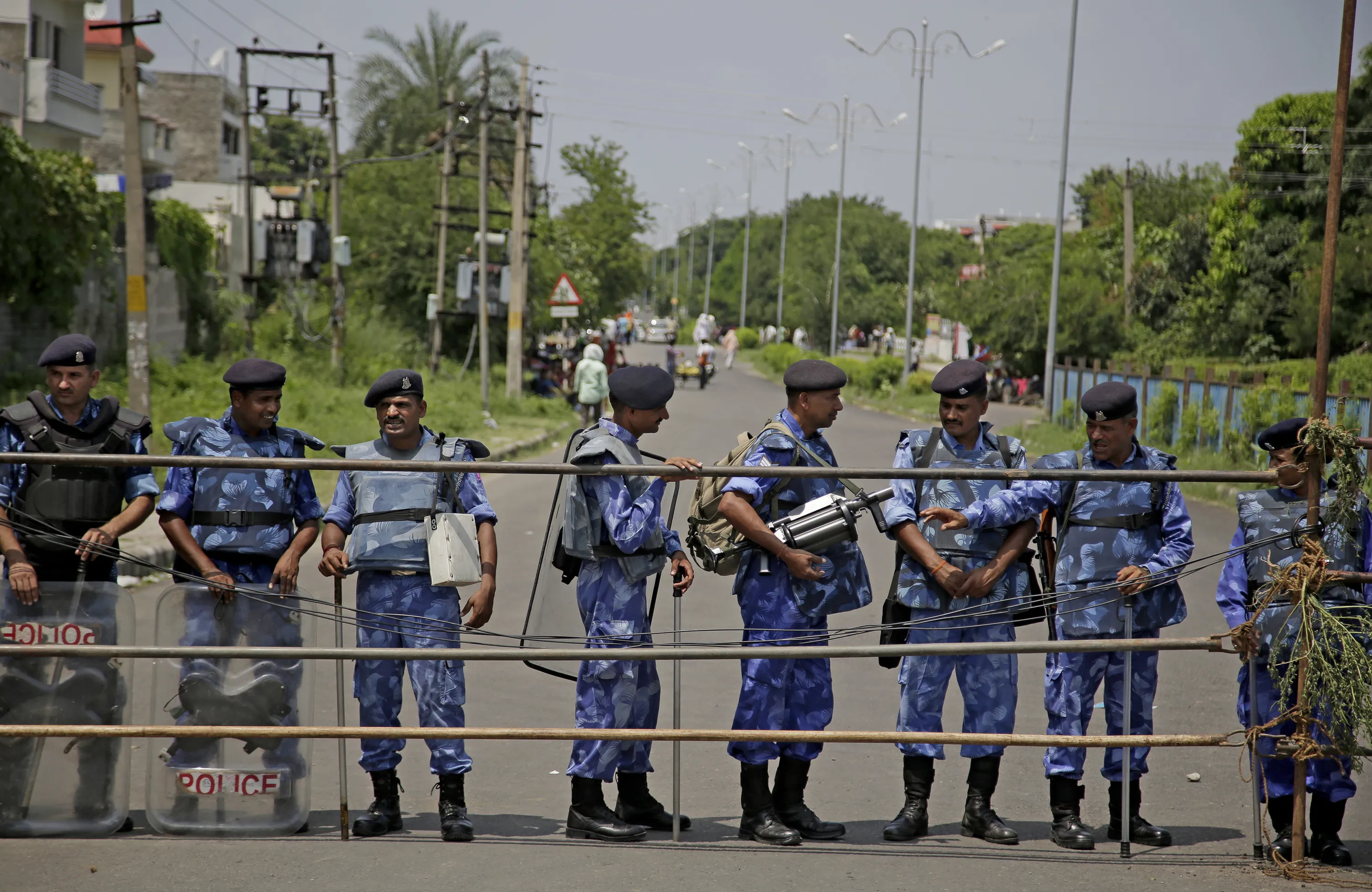 Indian anti-riot policemen stand guard on a barricaded road leading to a court in Panchkula, India, Thursday, August 24, 2017. (Photo by Altaf Qadri/AP Photo)
