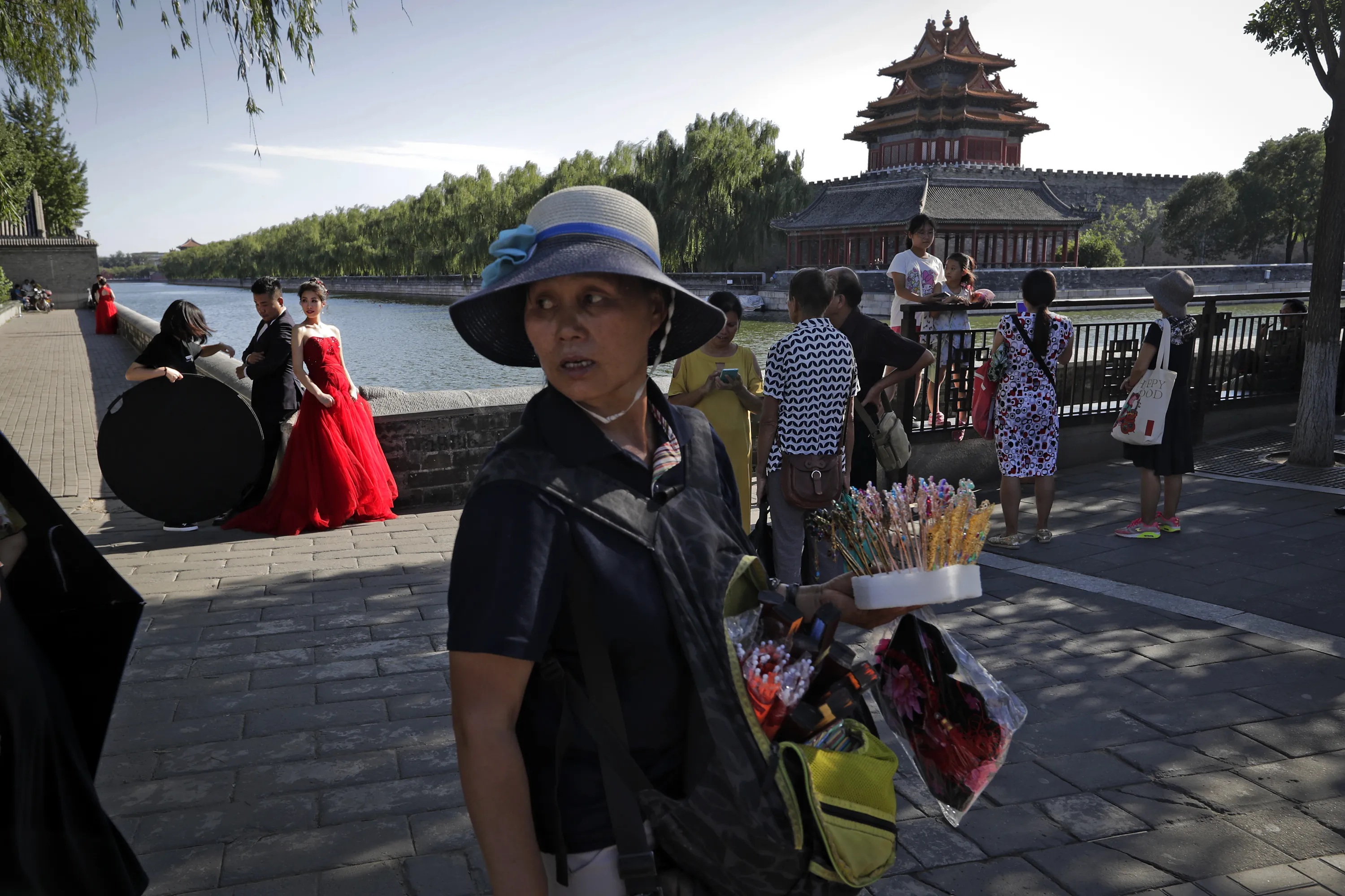 A vendor sells souvenirs as tourists gather near a bride and groom posing for their pre-wedding photos in front of the Turret of the Forbidden City in Beijing, Thursday, August 24, 2017. The Forbidden City, once the isolated palace of China's Ming and Qing Dynasty emperors and now turn into a major tourist attraction, located in the centre of capital city. (Photo by Andy Wong/AP Photo)