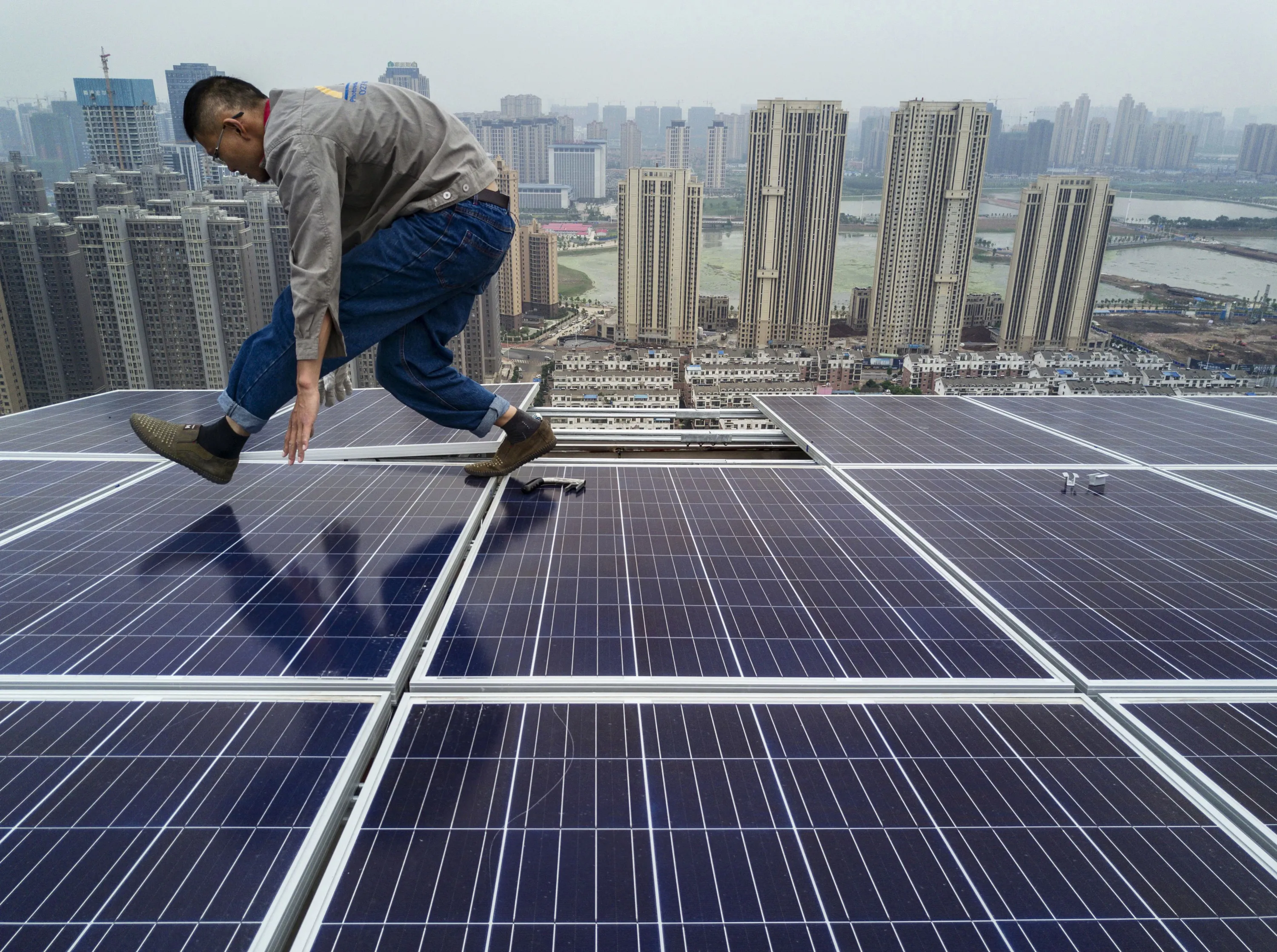 A Chinese worker from Wuhan Guangsheng Photovoltaic Company works on a solar panel project on the roof of a 47 story building in a new development on May 15, 2017 in Wuhan, China. China consumes more electricity than any other nation, but it is also the world's biggest producer of solar energy. Capacity in China hit 77 gigawatts in 2016 which helped a 50% jump in solar power growth worldwide. China is now home to two-thirds of the world's solar production, though capacity and consumption remain low relative to its population. Still, the country now buys half of the world's new solar panels which convert sunlight into energy, and are being installed on rooftops in cities and across sprawling fields in rural areas. Greenpeace estimates that by 2030, renewable energy could replace fossil fuels as China's primary source of power, a significant change in a country considered the world's biggest polluter. China's government has officially committed to development of renewable energies to ease the country's dependence on coal and other fossil fuels, though its strategic investments in the solar panel have created intense global competition. (Photo by Kevin Frayer/Getty Images)
