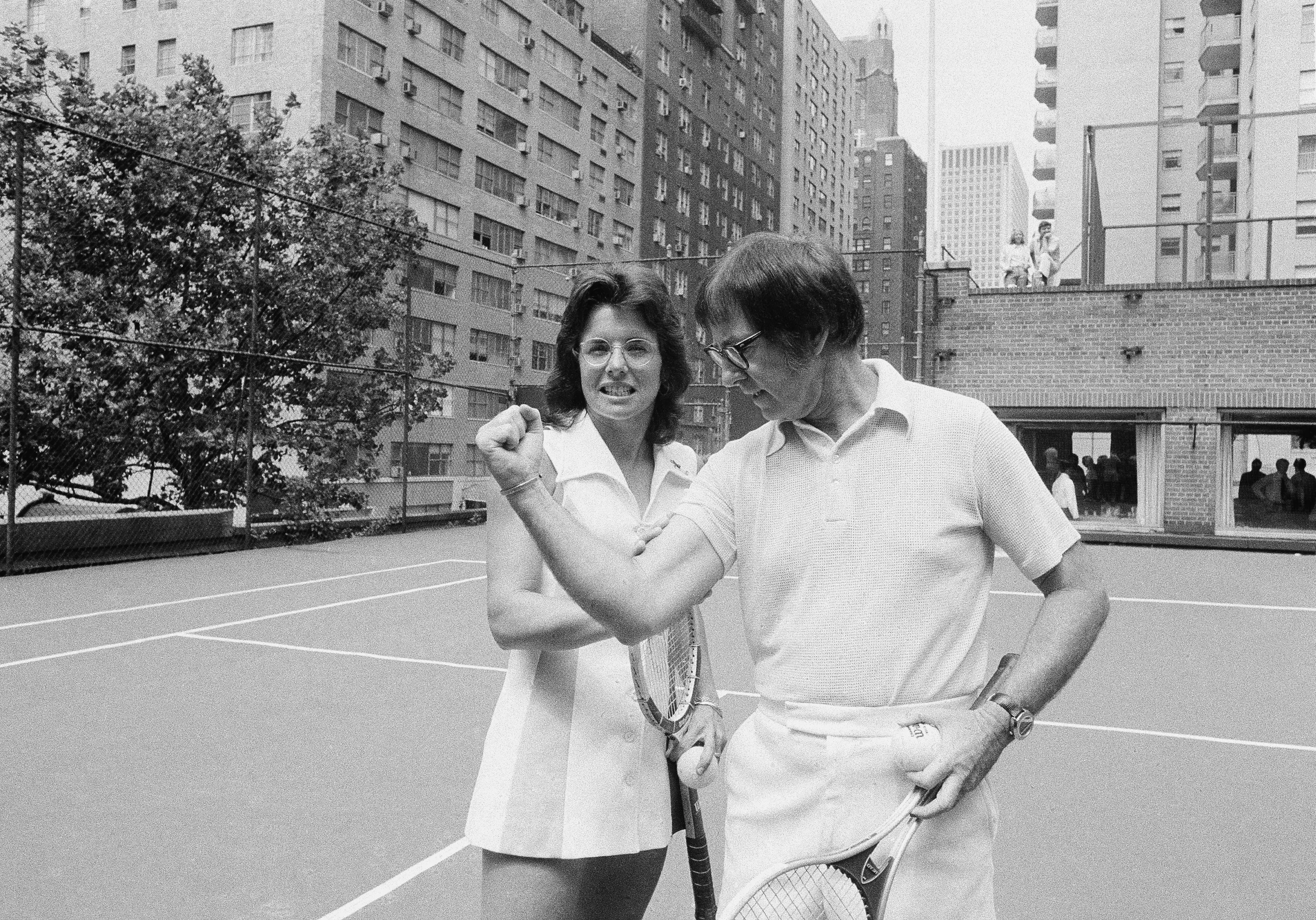 Wimbledon champion Billie Jean King checks the muscle on her nemesis, Bobby Riggs, in New York, July 11, 1973. King and Riggs announced they will meet in a $100,000 tennis grudge match like the one in which Riggs bested Margaret Court earlier this year. Time and place is yet to be announced. Mrs. King is 26 years younger than Riggs. (Photo by Anthony Camerano/AP Photo)