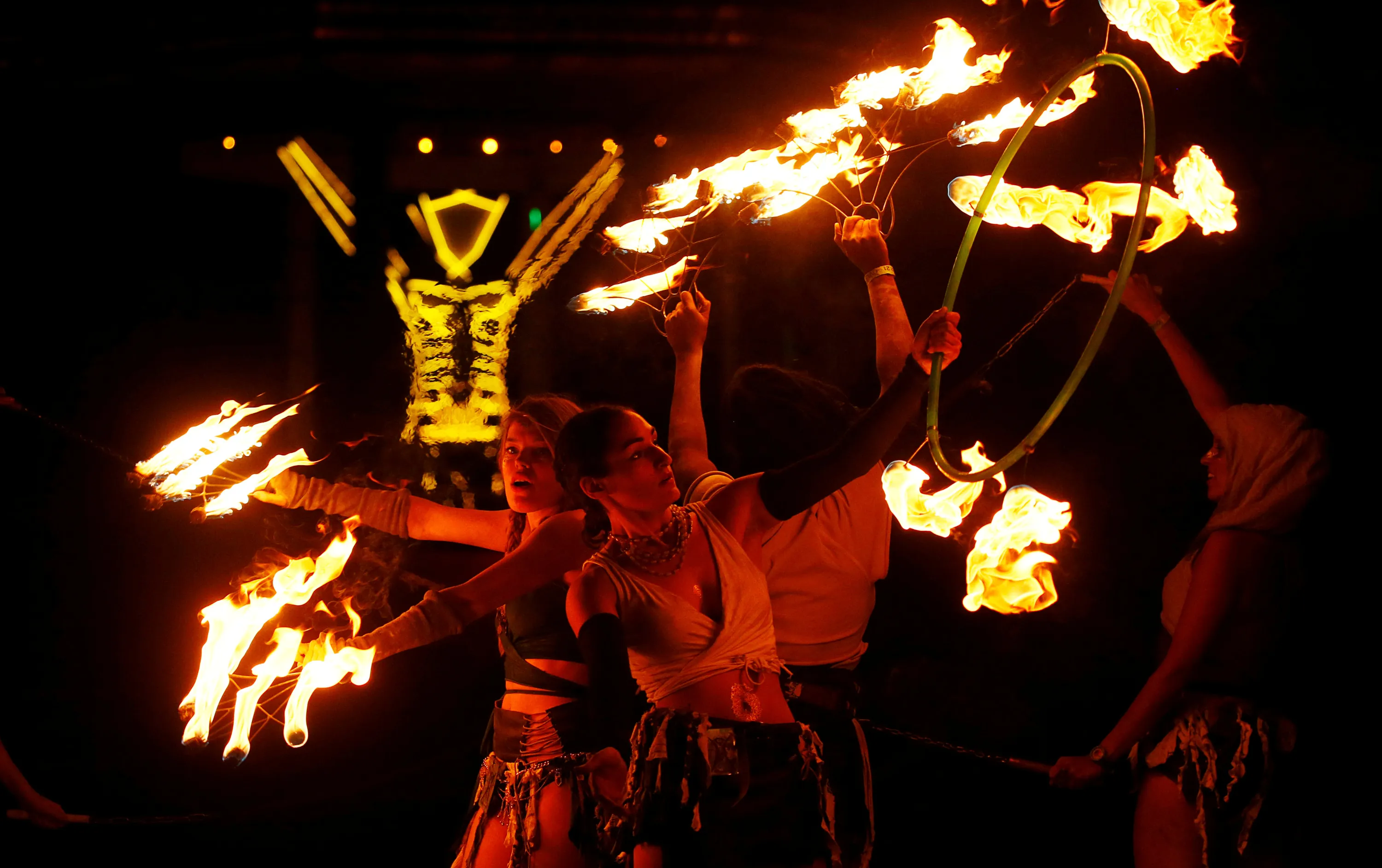 Burning Man participants from the “Revolutionary Motion” fire conclave spin fire in front of the effigy of “The Man” just before the effigy is burned at the culmination of the annual Burning Man arts and music festival in the Black Rock desert of Nevada, U.S. September 2, 2017. (Photo by Jim Bourg/Reuters)
