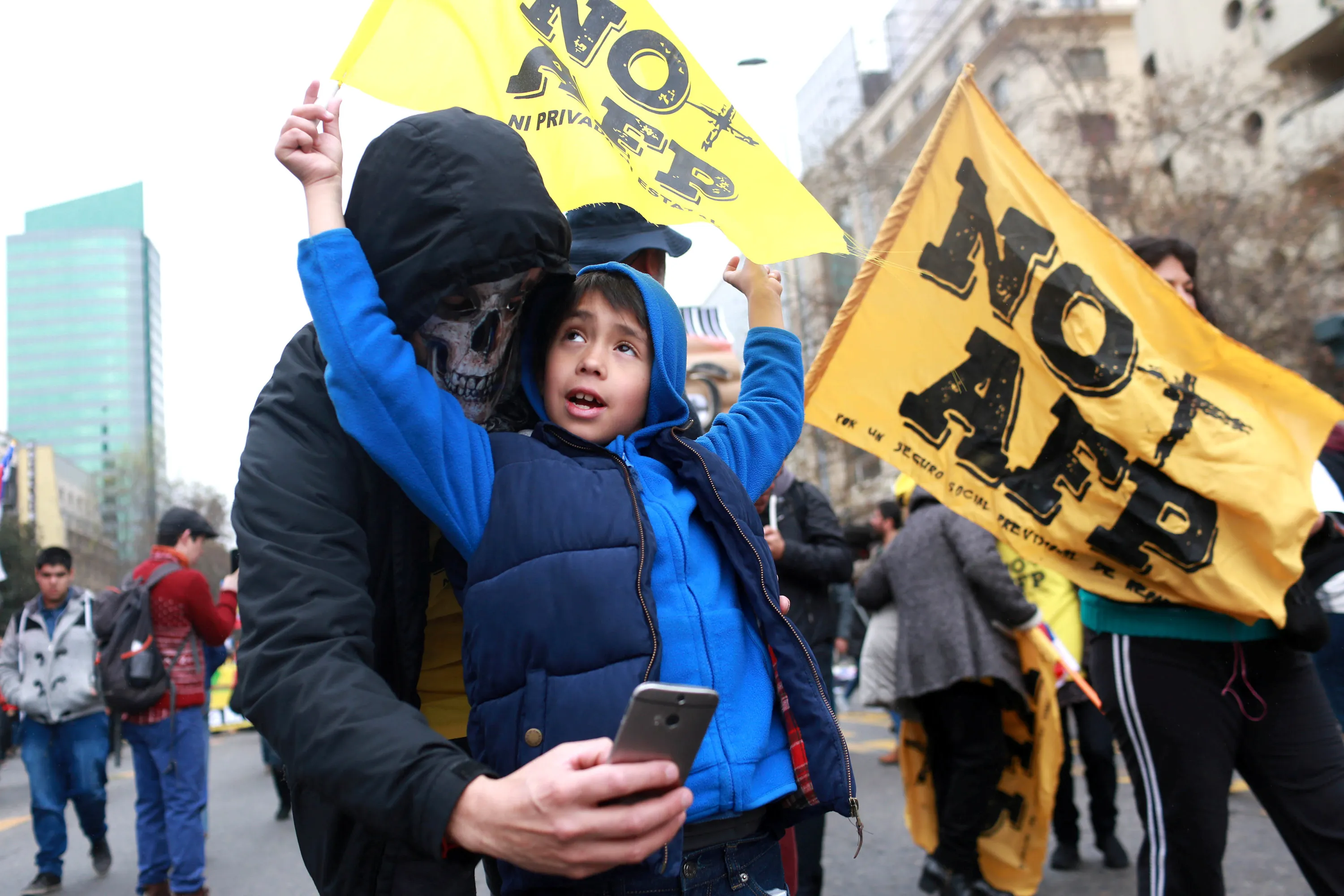 A demonstrator uses a mobile phone as they attend a march against the national pension system in Santiago, Chile September 3, 2017. The flags read “No more AFP (Pension Fund Administrators)”. (Photo by Pablo Sanhueza/Reuters)