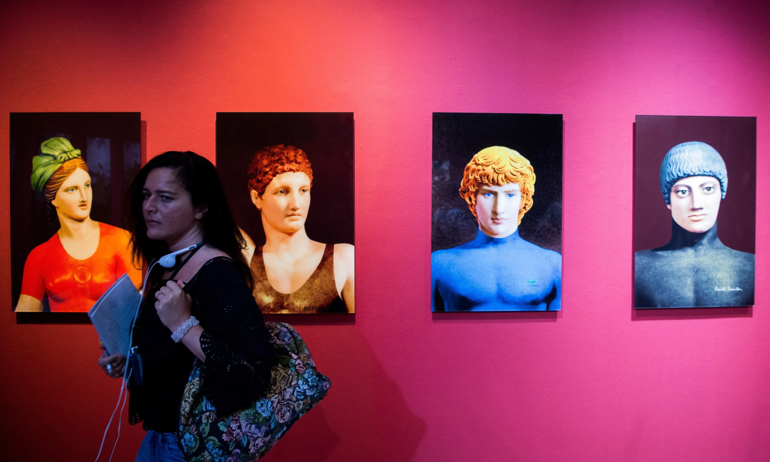 A visitor attends an exhibition entitled “New mythology” of Russian artist Olga Tobrelutz during a press preview at the Kunsthalle (Mucsarnok) in Budapest, Hungary, 05 September 2017, after three exhibitions under a joint title “Metamorphosis” opened to the public here. The large-scale exhibitions showing photographs by Brazilian documentary photographer and photojournalist Sebastiao Salgado, installations entitled “Borderland” by Slovakian artist Jozef Suchoza and artworks by Olga Tobrelutz will run until 12 November. (Photo by Zoltan Balogh/EPA/EFE)