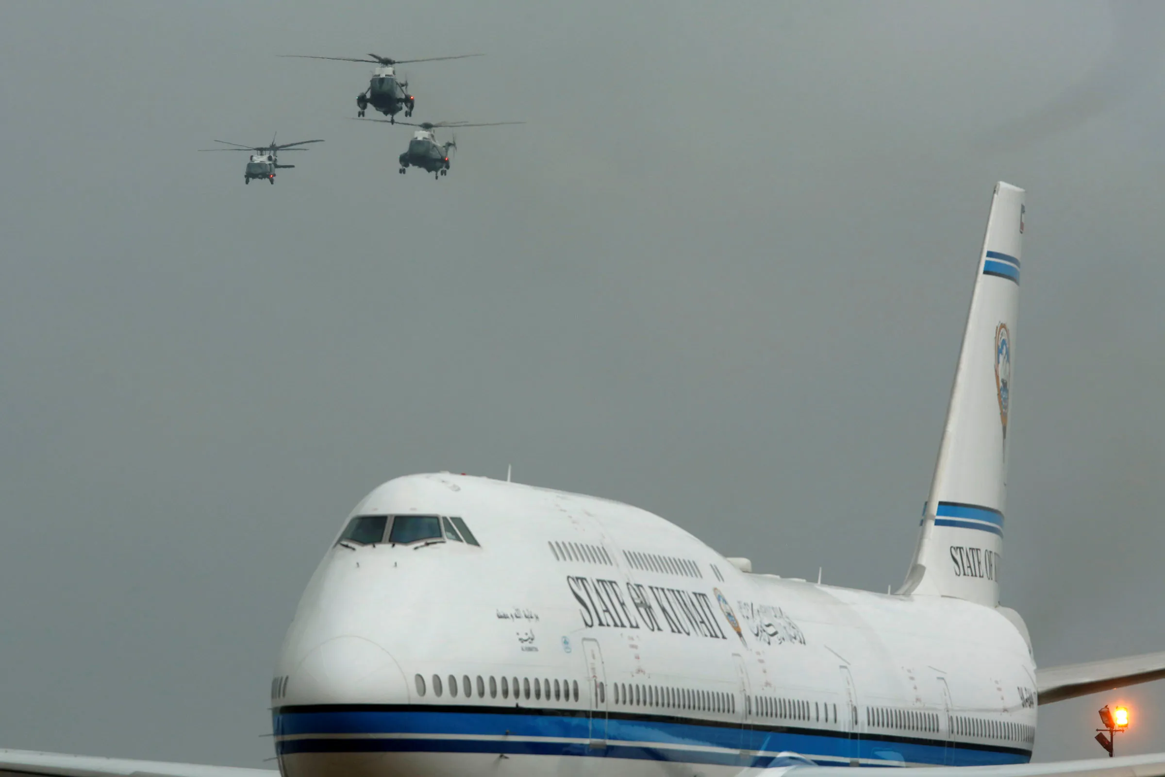 U.S. President Donald Trump flies over the just-landed plane of the Emir of Kuwait as Trump arrives on the Marine One helicopter to board Air Force One for travel to North Dakota from Joint Base Andrews, Maryland, U.S., September 6, 2017. (Photo by Jonathan Ernst/Reuters)