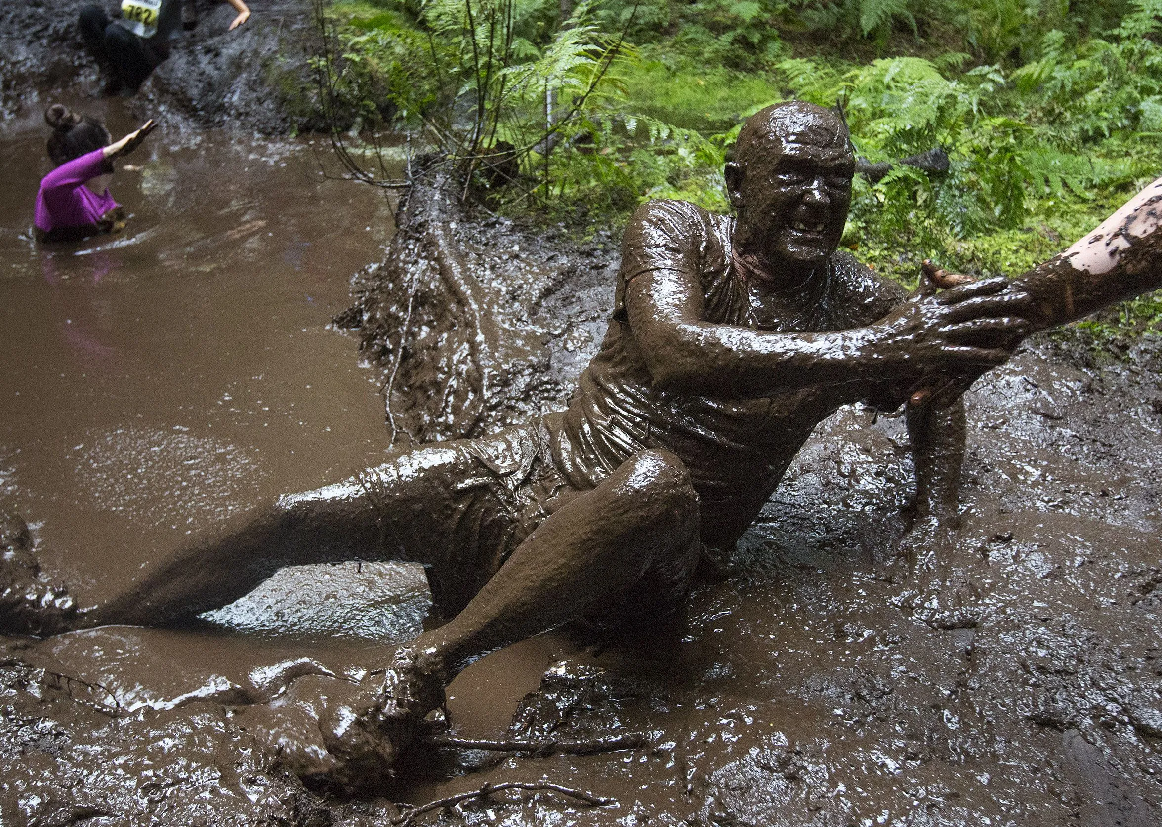 A helping hand for a contestant in the Muddy Trials race, said to be the world’s muddiest competition in Ayrshire, UK on September 11, 2017. Contestants came to Craufurdland estate in Fenwick in Ayrshire, Scotland to take apart in the world's muddiest race – the “Muddy Trials” . Runners race through deep and dark goey ditches, woodland trails and river crossings to get to the finish. (Photo by Michael McGurk/Rex Features/Shutterstock)