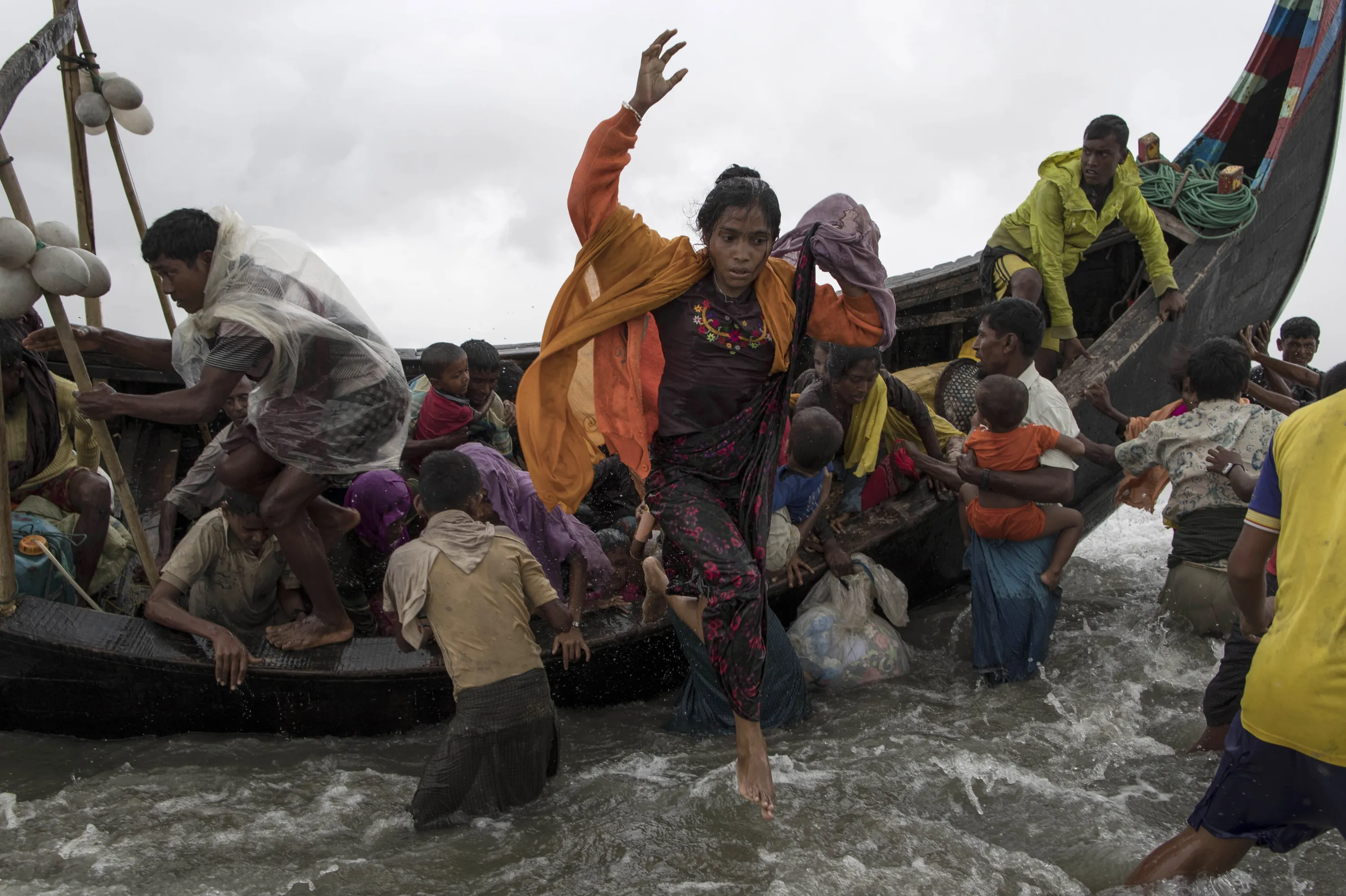Rohingya refugees jump from a wooden boat as it begins to tip over after travelling from Myanmar, on September 12, 2017 in Dakhinpara, Bangladesh. Recent reports have suggested that around 290,000 Rohingya have now fled Myanmar after violence erupted in Rakhine state. The “Muslim insurgents of the Arakan Rohingya Salvation Army” have issued statement that indicates that they are to observe a cease fire, and have asked the Myanmar government to reciprocate. (Photo by Dan Kitwood/Getty Images)