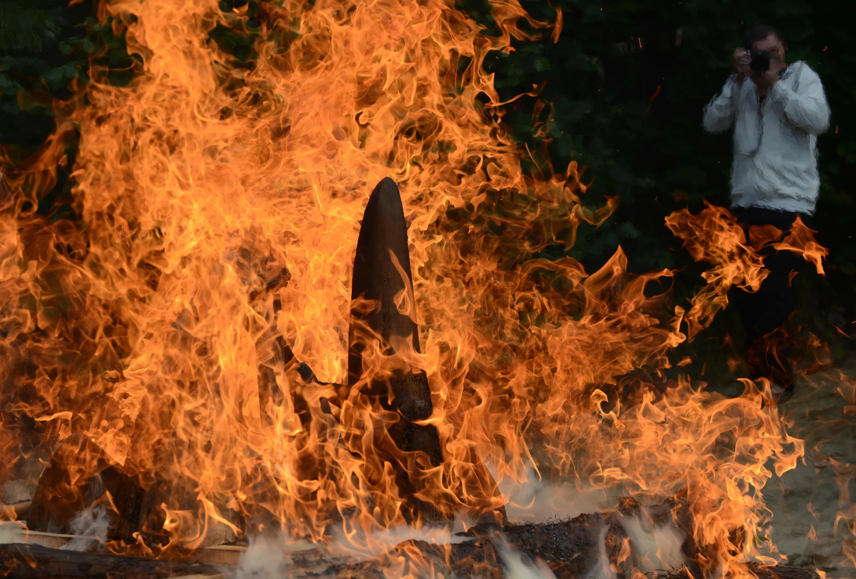 A journalist takes a photo of more then 33 kg of rhinoceros horns as they burn at a Zoo in Dvur Kralove, Czech Republic, on September 19, 2017. A Czech zoo on Tuesday burnt 33 kilos (72 pounds) of rhino horns, including some it had sawed off its own animals in the wake of a brutal attack on a French zoo The rhino horn burning event hopes to send a strong anti- poaching message. (Photo by Michal Cizek/AFP Photo)