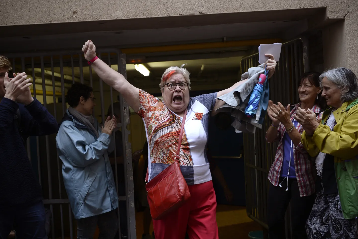 A woman celebrates outside a polling station after casting her vote in Barcelona, on October 01, 2017, in a referendum on independence for Catalonia banned by Madrid. Madrid has vowed to stop the referendum from going ahead, closing polling stations, seizing millions of ballot papers, detaining key organisers and shutting down websites promoting the vote. (Photo by Josep Lago/AFP Photo)