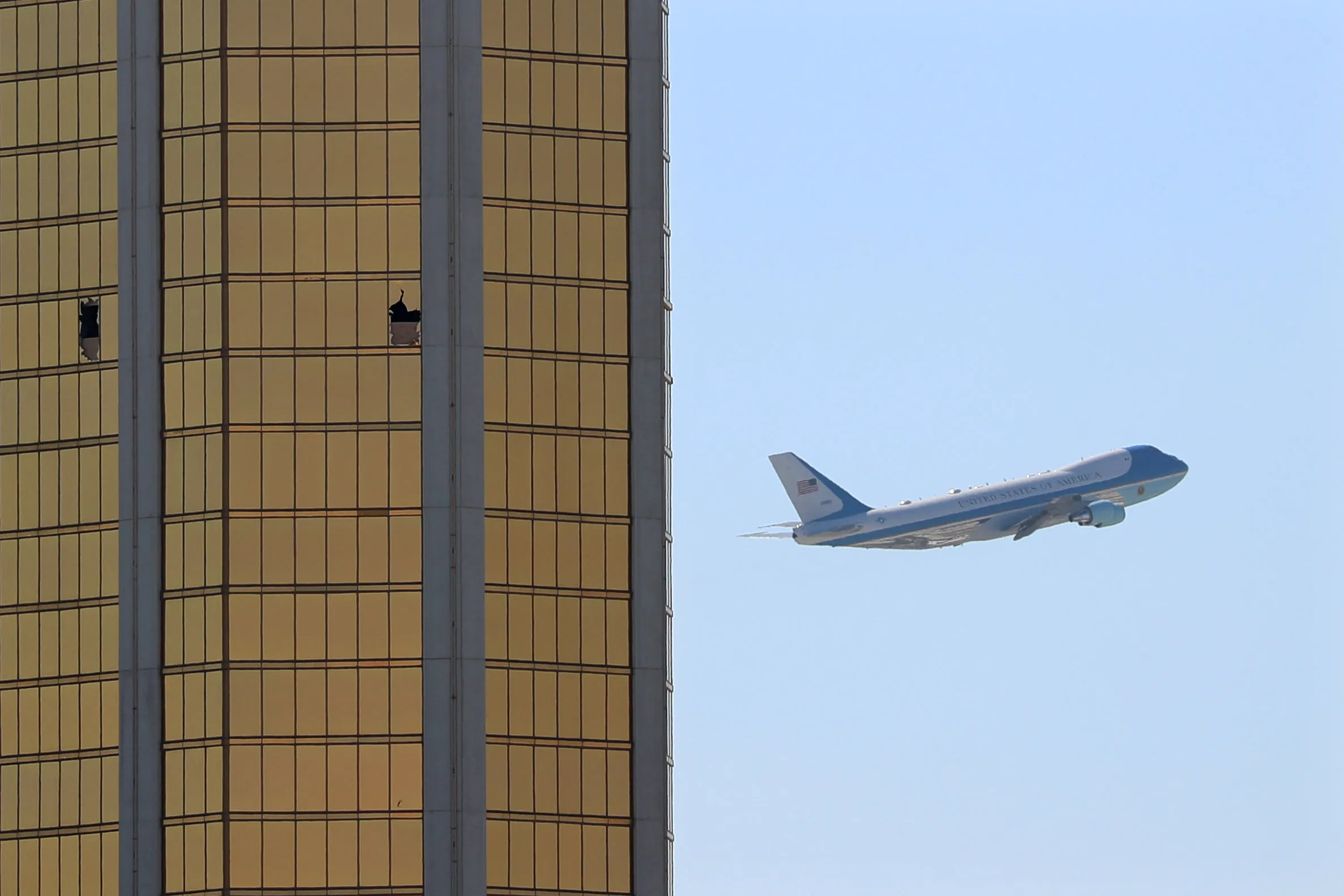 Air Force One departs Las Vegas past the broken windows on the Mandalay Bay hotel, where shooter Stephen Paddock conducted his mass shooting along the Las Vegas Strip in Las Vegas, Nevada, U.S., October 4, 2017. (Photo by Mike Blake/Reuters)