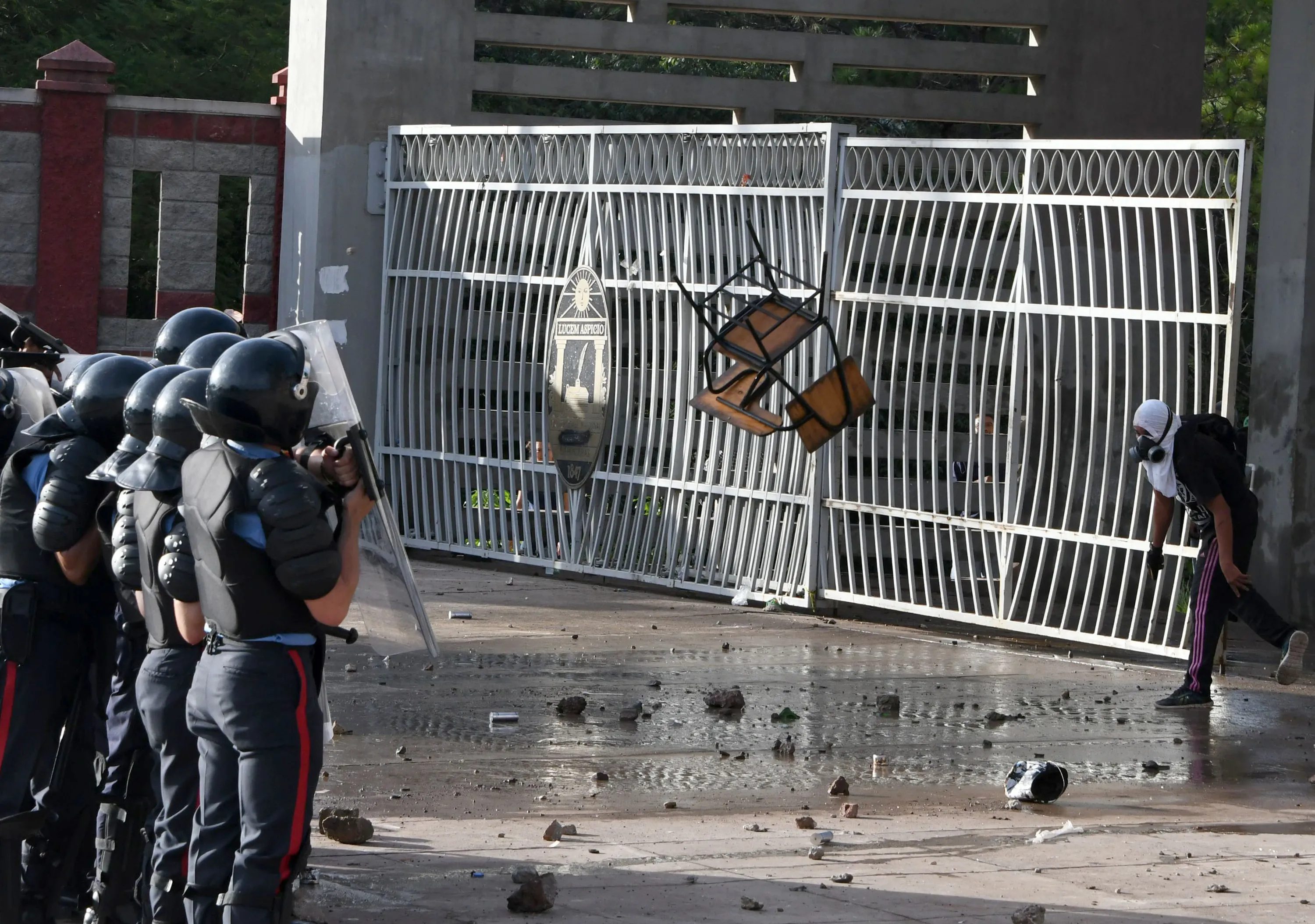 A masked student from the National Autonomous University of Honduras (UNAH), takes part in clashes with riot police during a protest against the reelection of President Juan Orlando Hernandez in Tegucigalpa on October 18, 2017. 39 days ahead of national elections students gathered under the University Student Movement (MEU) assure presidential reelection is not allowed in the country. (Photo by Orlando Sierra/AFP Photo)
