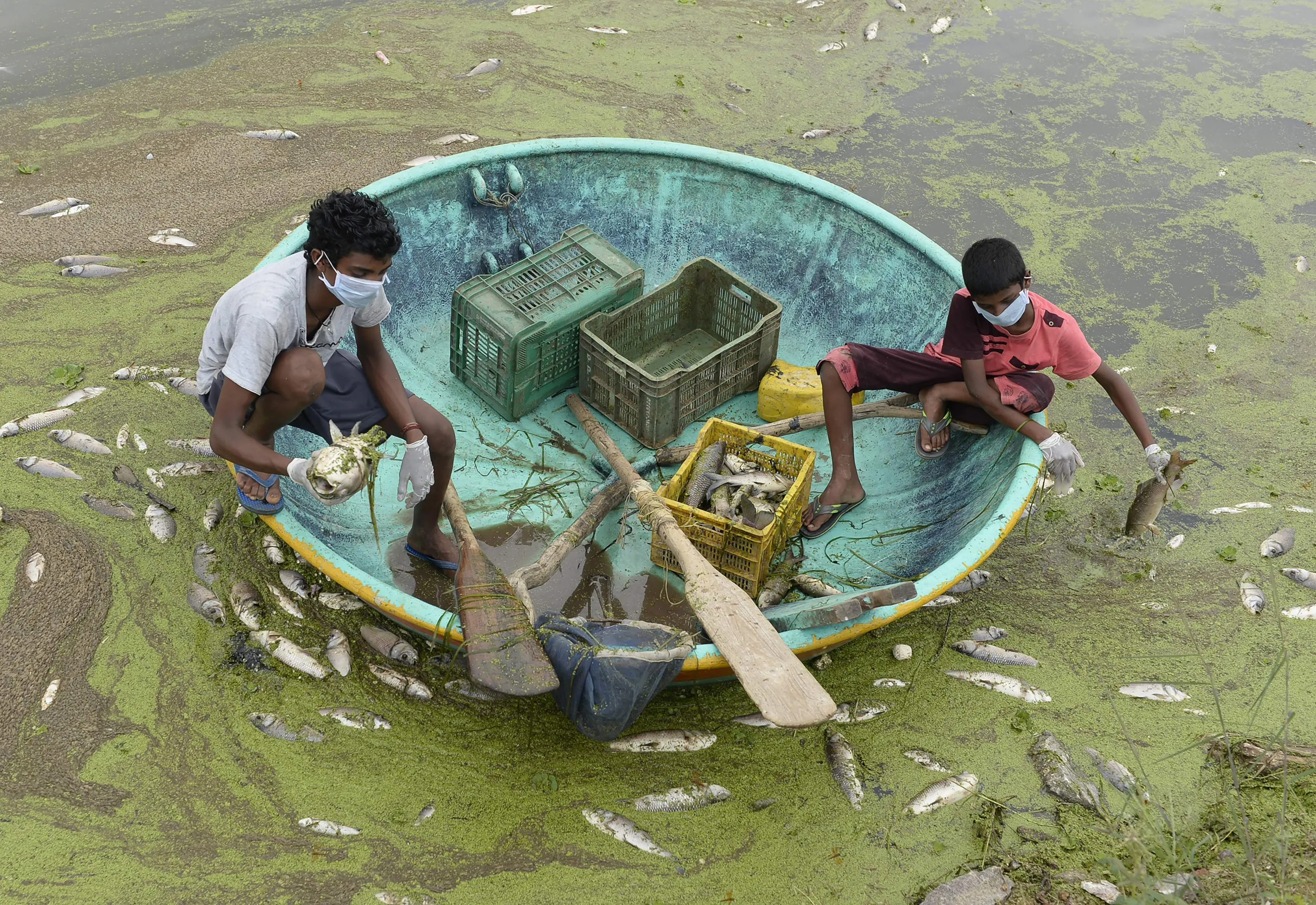 Indian fishermen collect dead fish in Gandi Lake in Sangareddy district near Hyderabad on October 6, 2017. Indian authorities said around 70 to 80 percent of the fish Gandi Lake had died after waste chemicals were released from a nearby industrial estate over the last 48 hours following heavy rains. (Photo by Noah Seelam/AFP Photo)