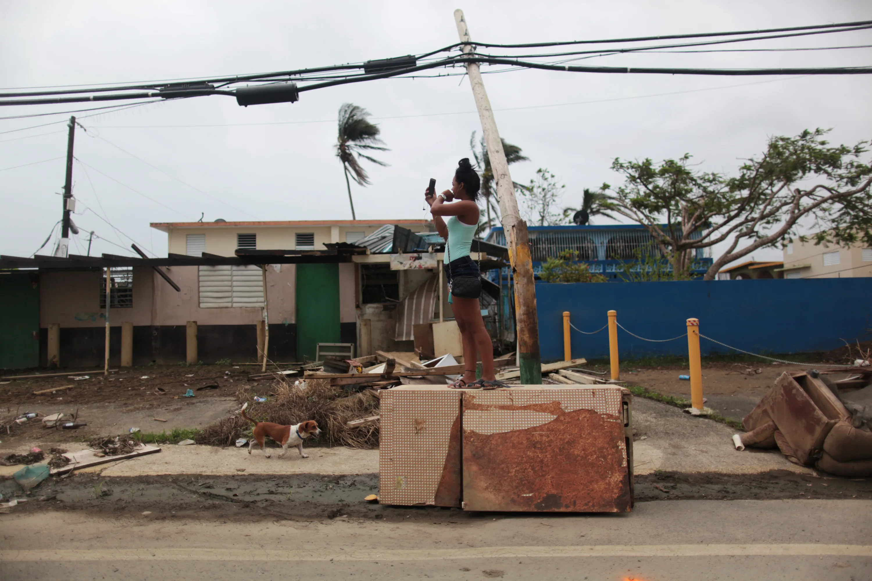 A woman stands on an overturned refrigerator while trying to get a mobile phone signal, after Hurricane Maria hit the island in September, in Toa Baja, Puerto Rico on October 19, 2017. (Photo by Alvin Baez/Reuters)