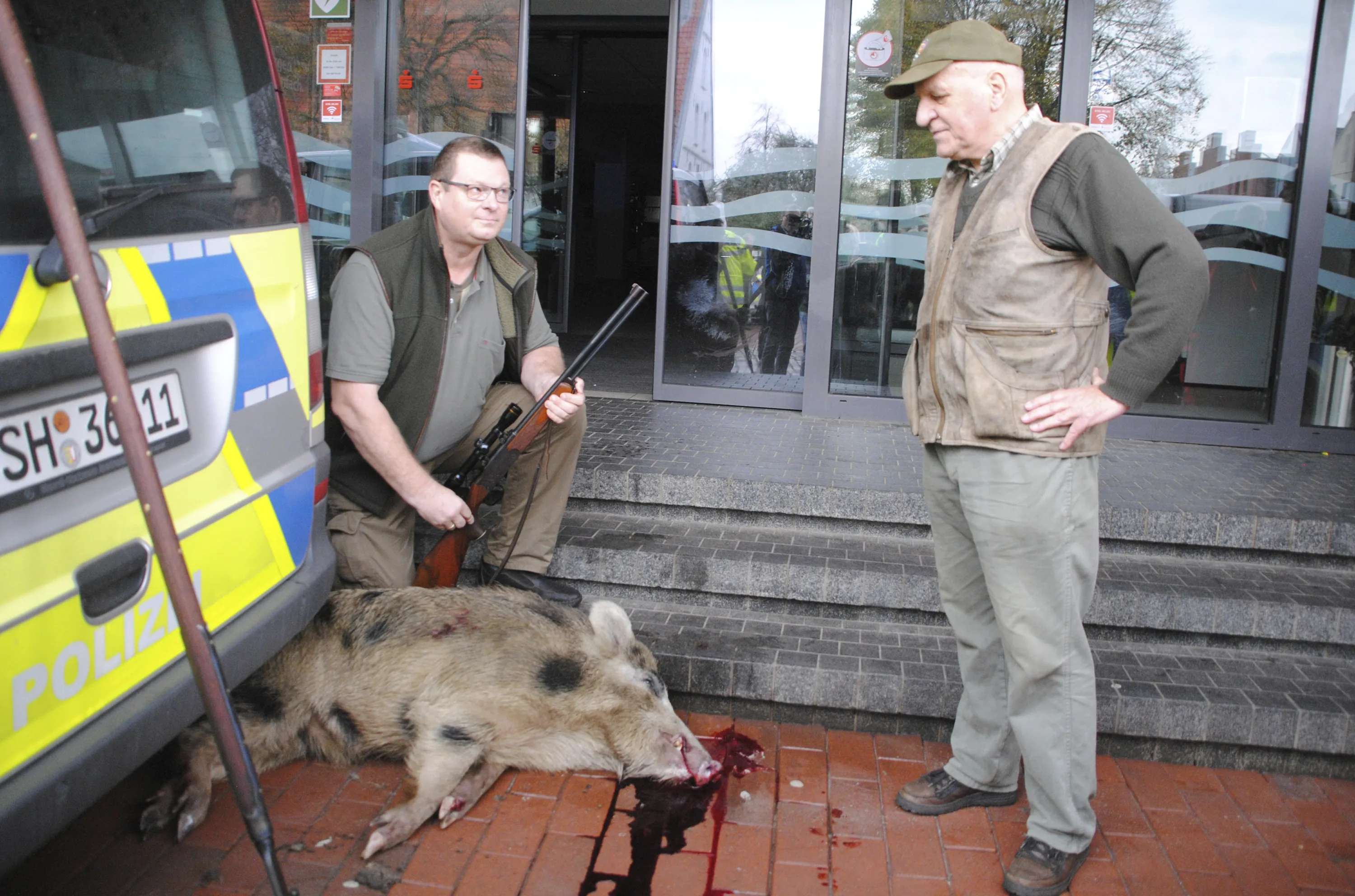 Hunter Uwe Ingwersen, left, and Horst Allwardt right look at the wild boar that was shot in the center of Heide, northern Germany, Friday, October 20, 2017. Police say a pair of wild boars have gone on the rampage and injured at least four people in the north German town of Heide. Authorities warned people to stay indoors after the adult animals appeared early Friday and began attacking pedestrians. Police said one of the boars was shot dead outside a bank, the other is still on the run. (Photo by Helge Holmson/DPA via AP Photo)
