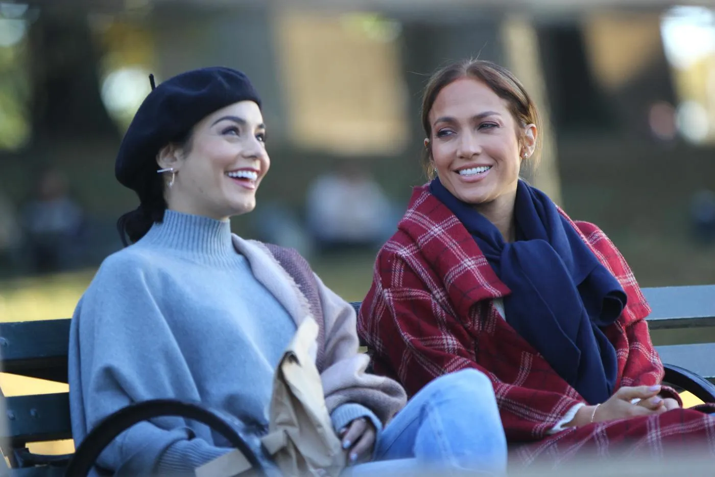 Jennifer Lopez and Vanessa Hudgens filming on the set of Second Act in Queens. New York, NY on Saturday October 28, 2017. (Photo by Eric Kowalsky/PacificCoastNews)