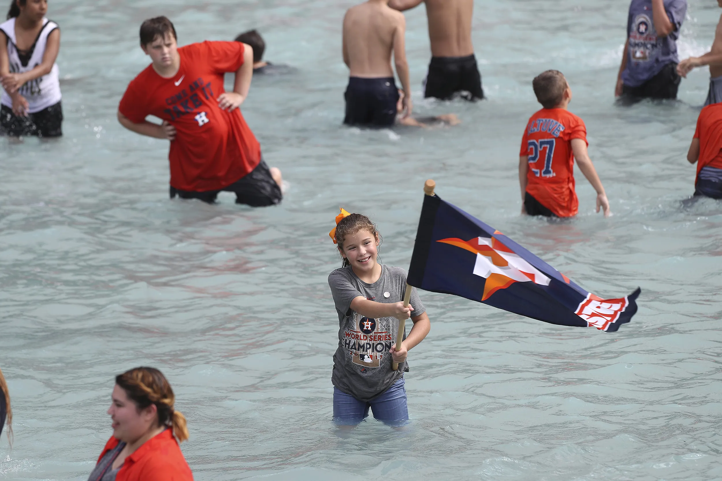 A young fan holds a team flag during the parade and celebration for the baseball World Series champion Houston Astros, Friday, November 3, 2017, in Houston. (Photo by Steve Gonzales/Houston Chronicle via AP Photo)