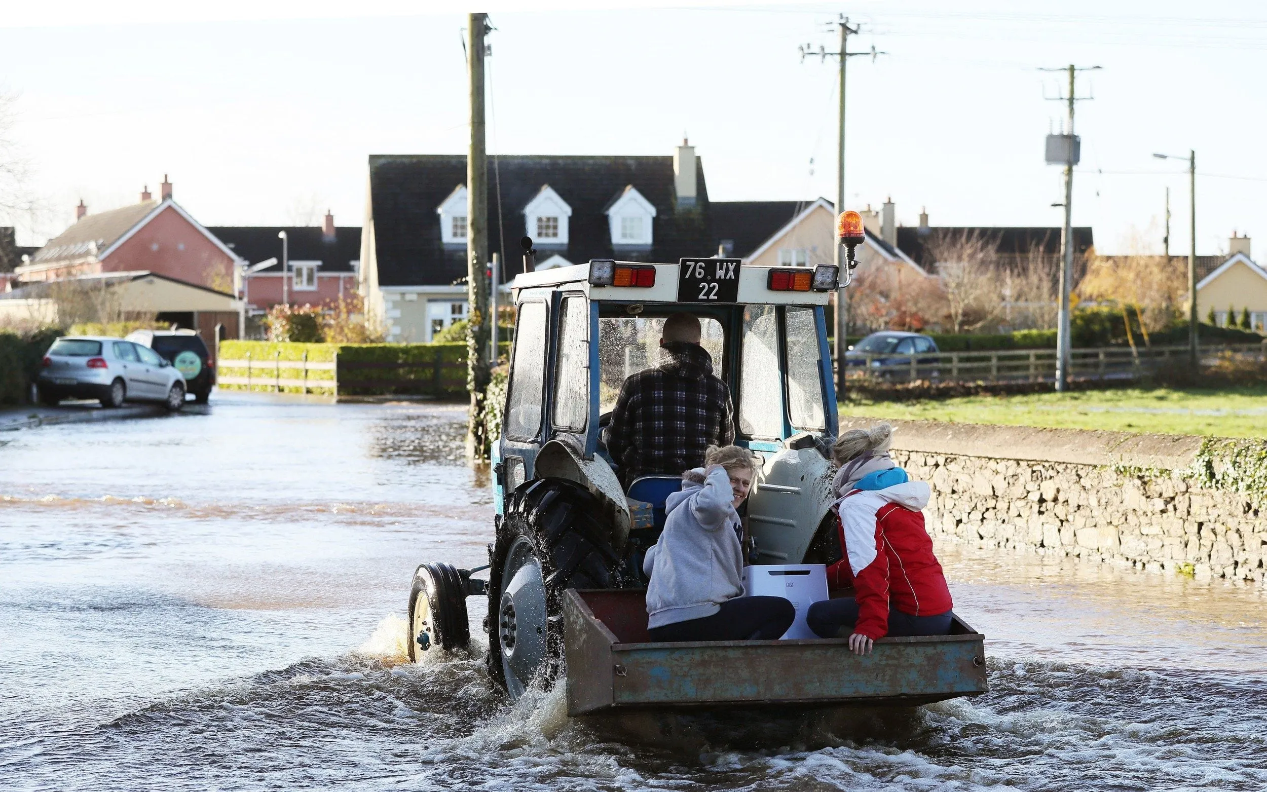 Women take a lift from a tractor up Manor street in Mountmellick, Co Laois, Ireland on November 23, 2017, after three rivers burst their banks and flooded dozens of homes. (Photo by Brian Lawless/PA Images via Getty Images)