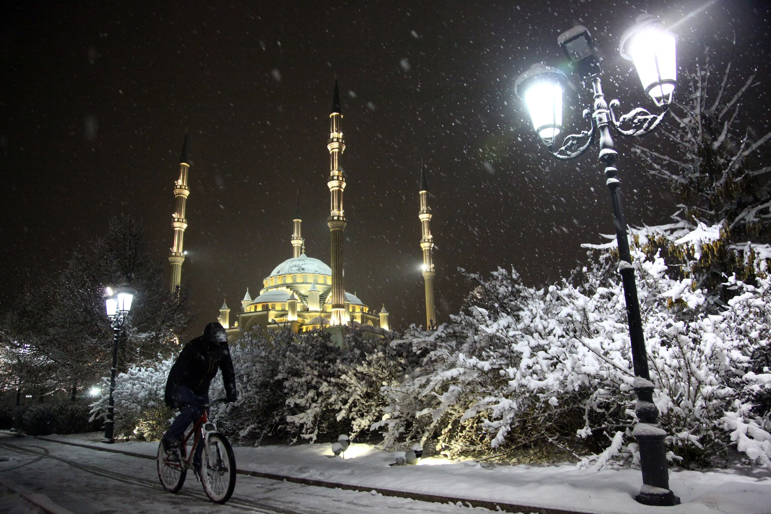 A man rides a bicycle during a snowfall, as the main Mosque is illuminated for New Year celebrations in downtown Grozny, the capital of Chechnya, Russia, Friday, December 8, 2017. (Photo by Musa Sadulayev/AP Photo)
