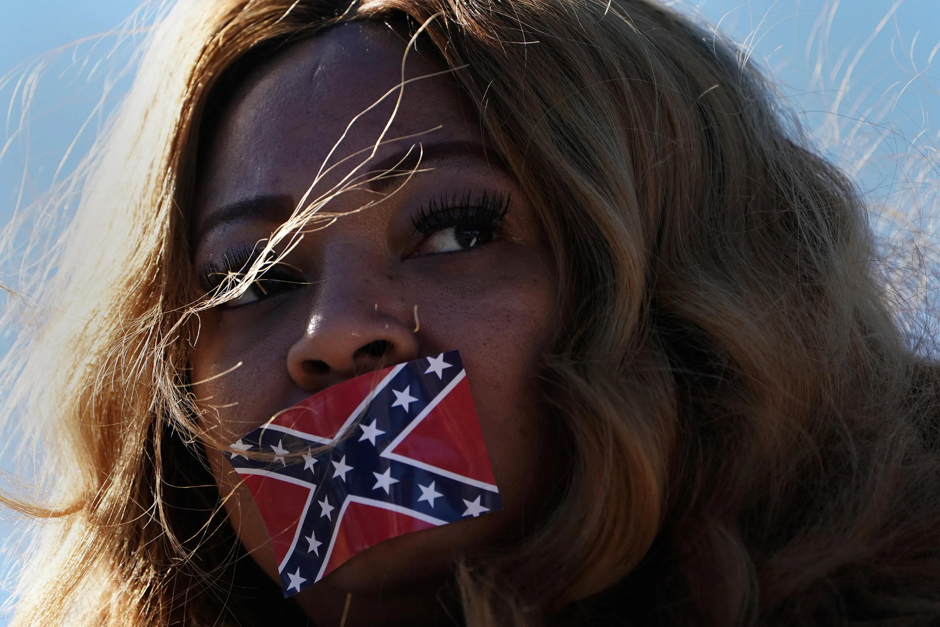 Edelia Carthan stands in silent protest with a confederate flag sticker covering her mouth during the official opening ceremony for the Mississippi Civil Rights Museum in Jackson, Miss., December 9, 2017. (Photo by Carlo Allegri/Reuters)