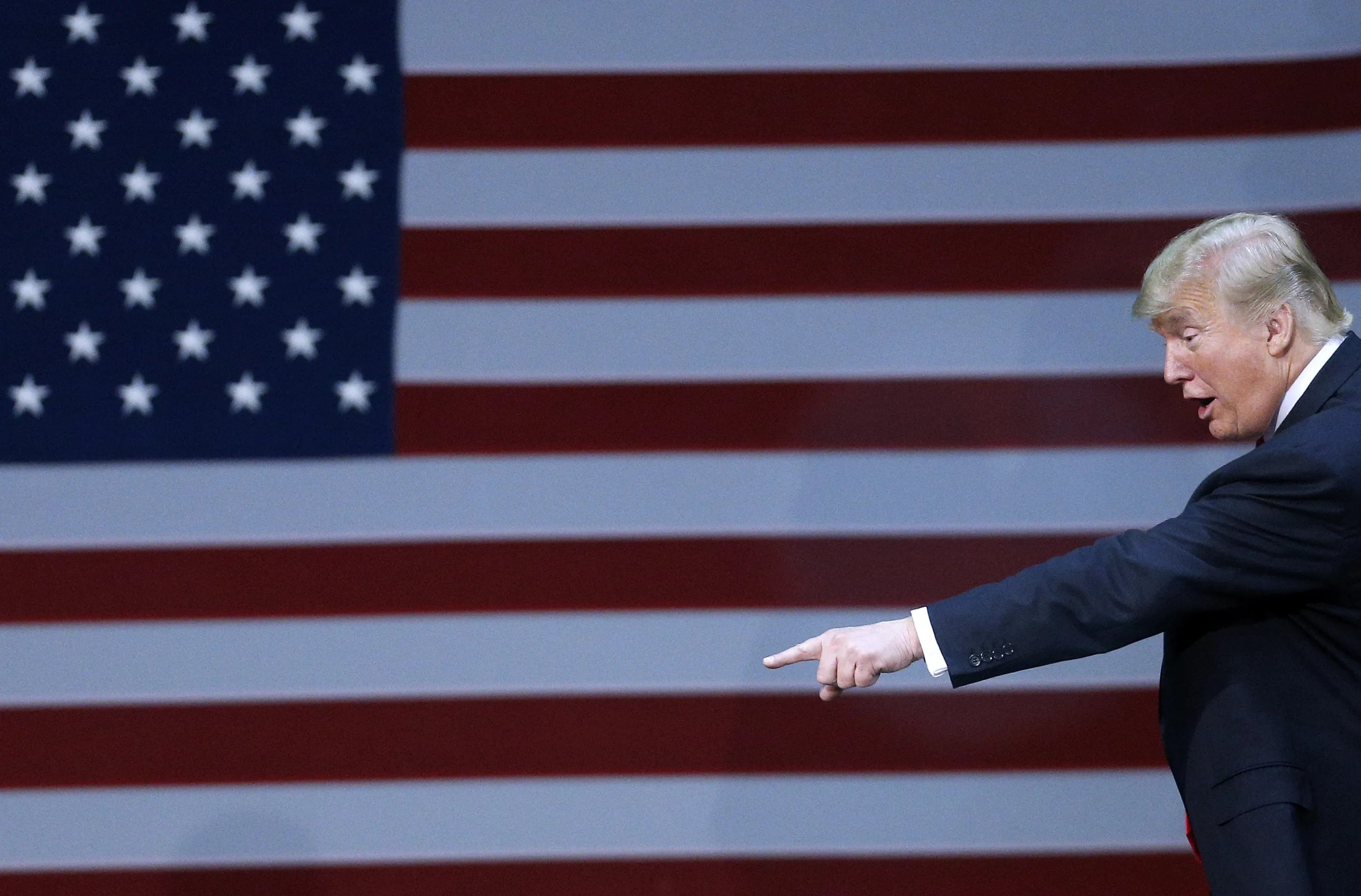 President Donald Trump points to the crowd after a rally in Pensacola, Fla., Friday, December 8, 2017. (Photo by Jonathan Bachman/AP Photo)