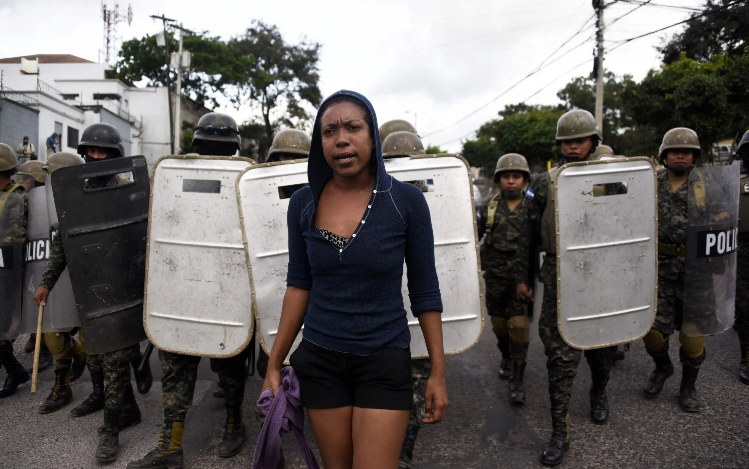 Military police stand guard next to supporters of opposition candidate Salvador Nasralla as they hold a protest march on December 6, 2017 in Tegucigalpa, Honduras. Honduras appeared set for a recount of its election Tuesday after incumbent President Juan Orlando Hernandez welcomed a demand by the opposition to re- open ballot boxes, a week into a crisis triggered by rigging claims. The small Central American nation of 10 million people has been plunged into uncertainty punctuated with clashes since the November 26 election pitting Hernandez against leftwing former TV presenter Salvador Nasralla, with both sides claiming victory. (Photo by Johan Ordonez/AFP Photo)