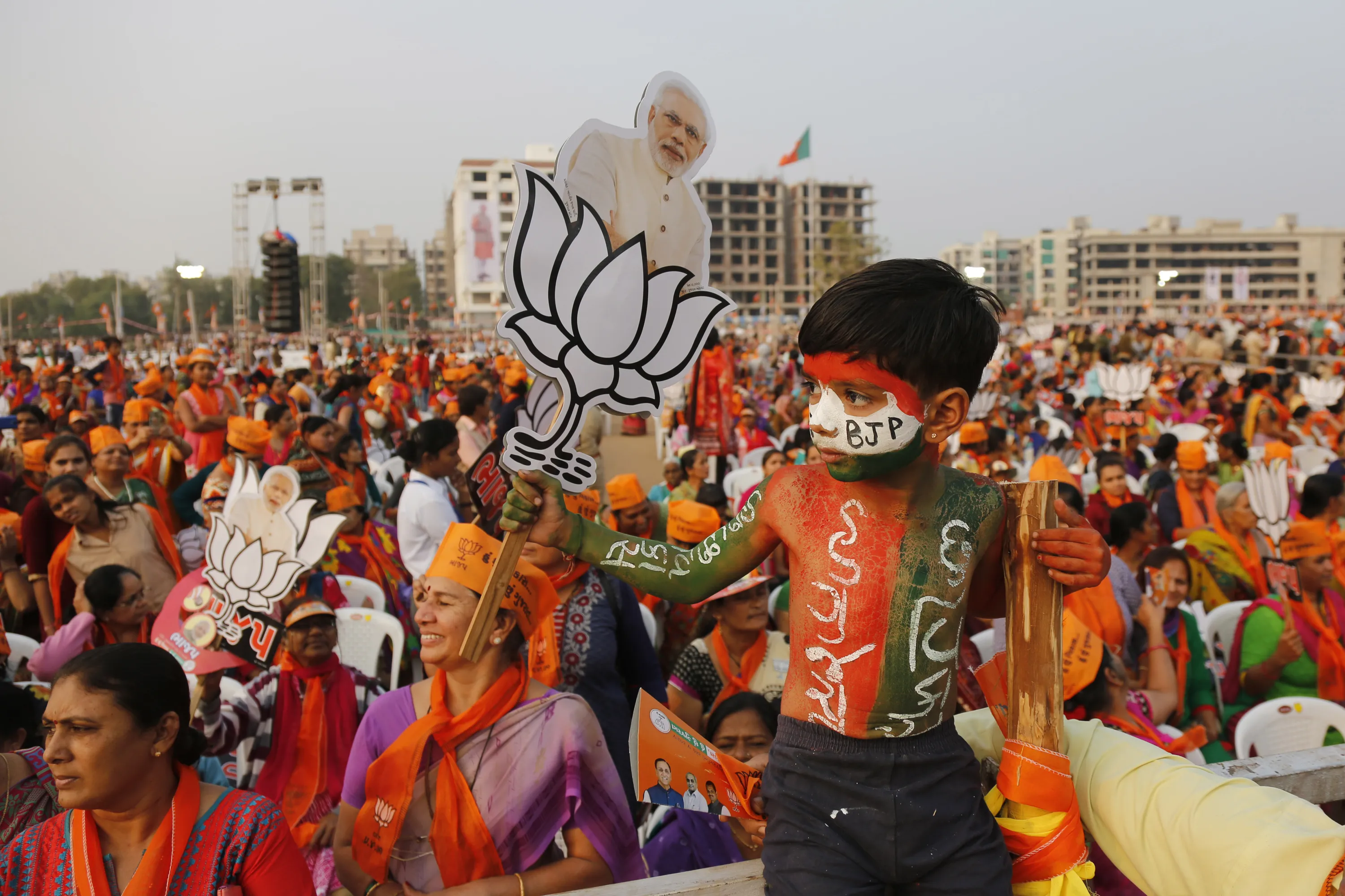 An Indian child with his body painted holds a cut out of Indian Prime Minister Narendra Modi with a symbol of the Bharatiya Janata Party (BJP) during an election campaign rally in Ahmadabad, India, Friday, December 8, 2017. Modi is on a two-day visit to Gujarat to campaign for the BJP in the Gujarat state assembly election which will be held on Dec. 9 and Dec. 14. Gujarati on the boy's body reads, “I am Gujarat – I am development”. (Photo by Ajit Solanki/AP Photo)