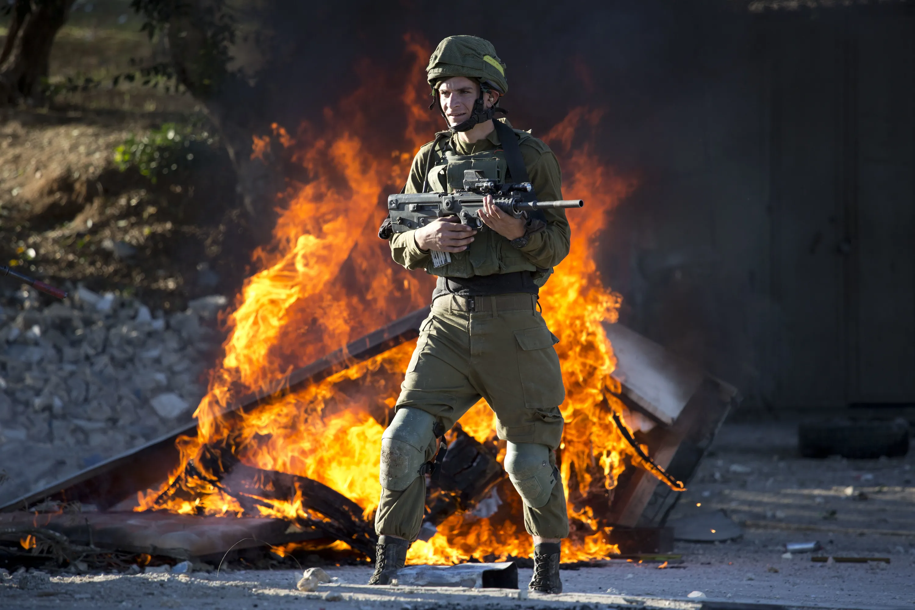 Israeli soldier stands during clashes with Palestinians following a protest against U.S. President Donald Trump's decision to recognize Jerusalem as the capital of Israel in the West Bank City of Nablus, Friday, December 8, 2017. (Photo by Majdi Mohammed/AP Photo)