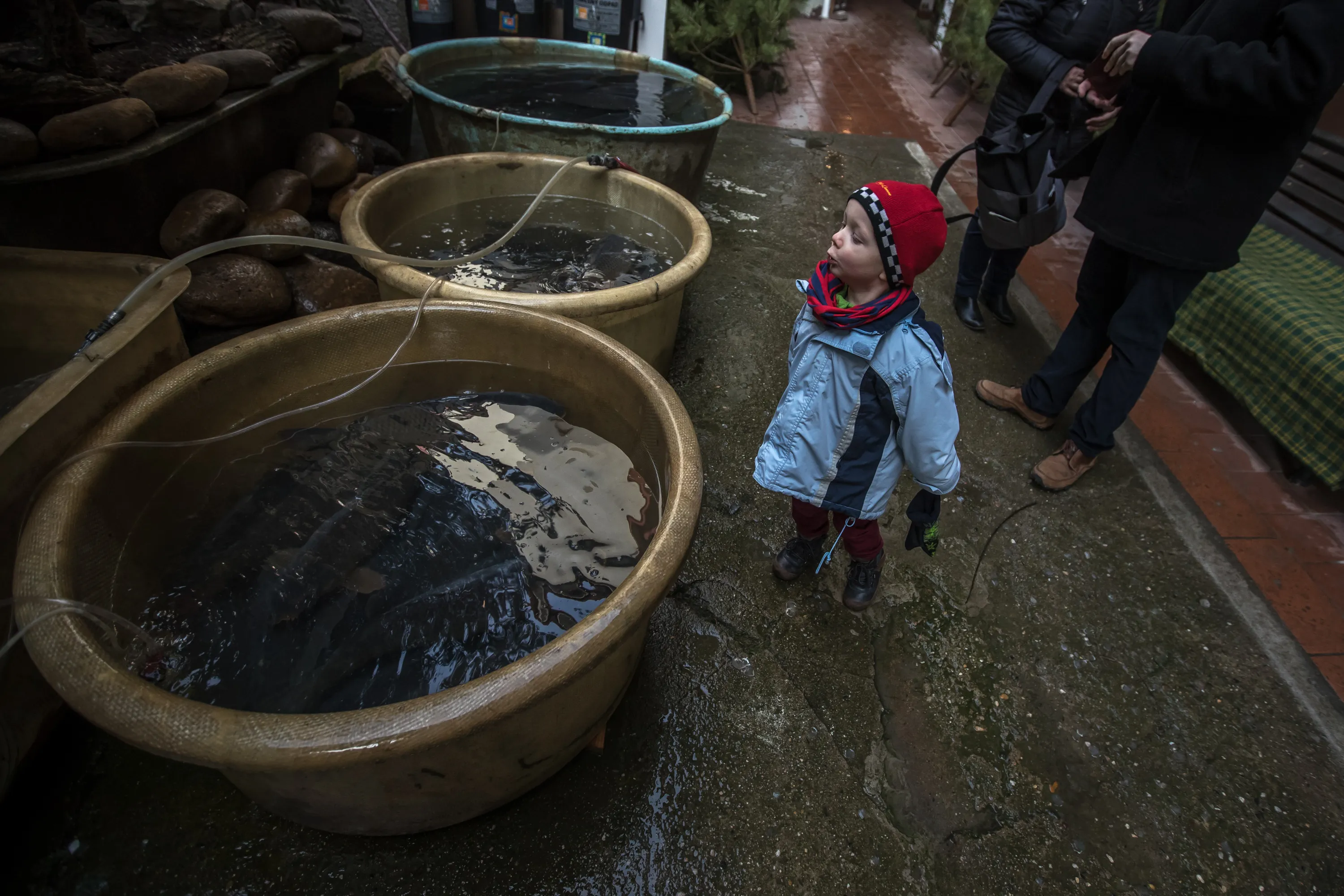 A child looks at carp in tubs at a street sale in downtown Prague, Czech Republic, 22 December 2017. Street sale of carp is an old Czech tradition, as fish soup and fried carp with potatoe salad is one of the most popular Christmas dishes in the Czech Republic. (Photo by Martin Divisek/EPA/EFE)